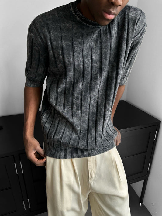 Slim Fit Washed Lines Strick-T-Shirt - Anthrazit