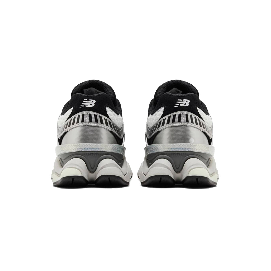 The New Balance 9060 Shoe Palace Metallic in collaboration with Shoe Palace, features a white mesh upper and grey leather overlays with black suede details. The ABZORB and SBS dual-density foam midsole, combined with a rubber outsole complete the design of the sneaker
