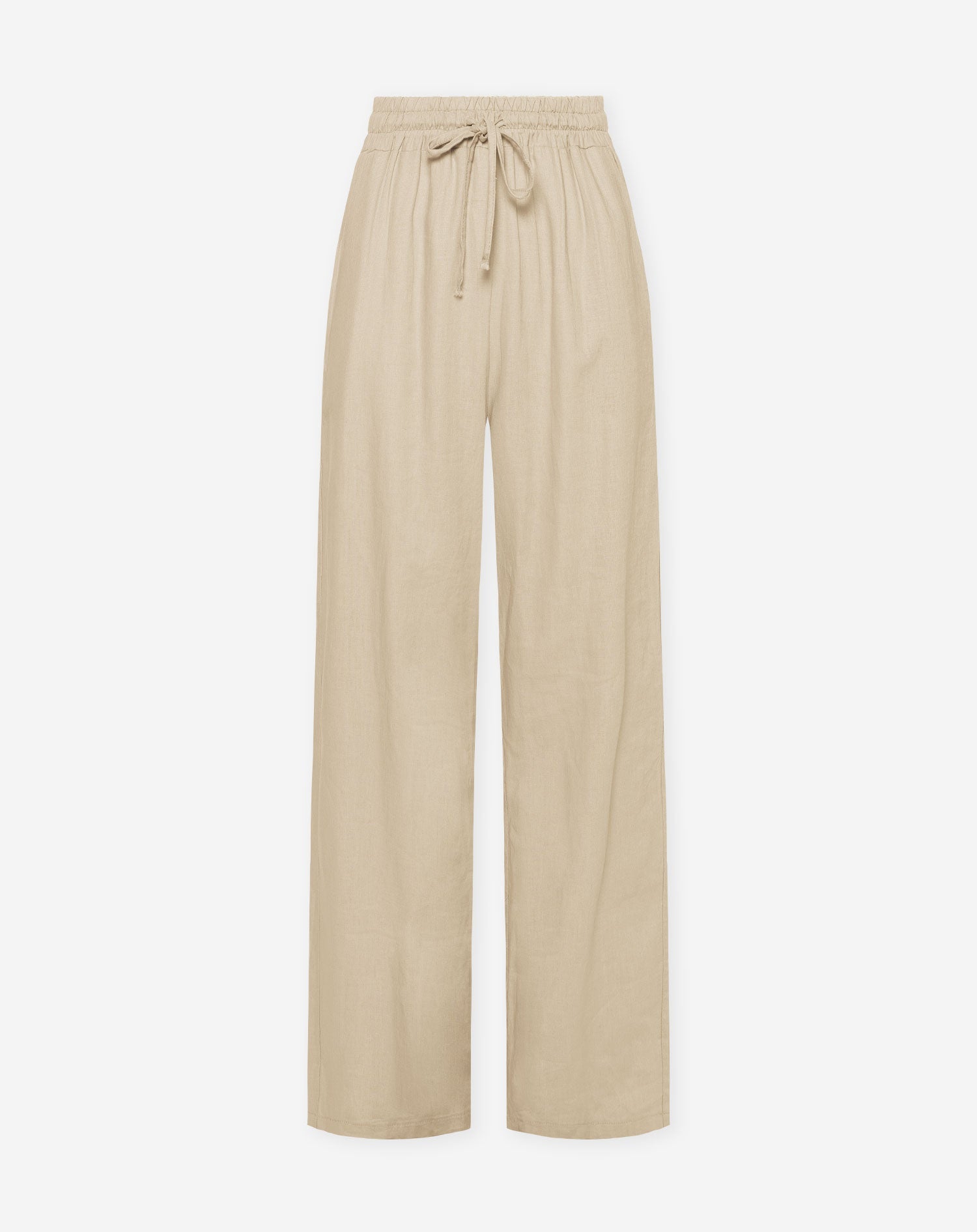 De pantalon is gemaakt van linnen en Viscose. De pantalon heeft een elastieken band rond het middel en heeft een heeft 2 koordjes waarmee je deze strakker kunt trekken. De pantalon heeft wijde pijpen en heeft zakken aan de zijkant.