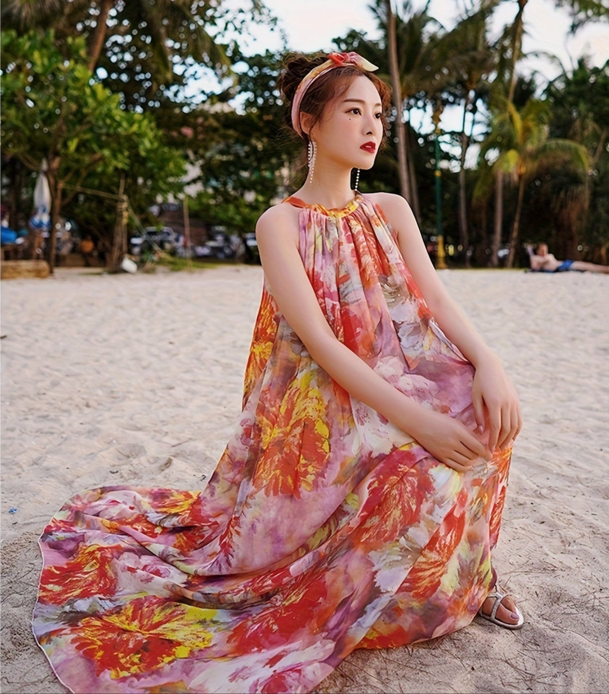 Deze prachtige bohemian maxi jurk straalt pure elegantie uit met haar luchtige pasvorm en kleurrijke bloemenprint. De vloeiende stof beweegt sierlijk mee bij elke stap, waardoor je een speelse maar chique look krijgt. Perfect voor zomerse stranddagen of een relaxte avondwandeling – haal jouw favoriet nu bij Mowa-Mode!