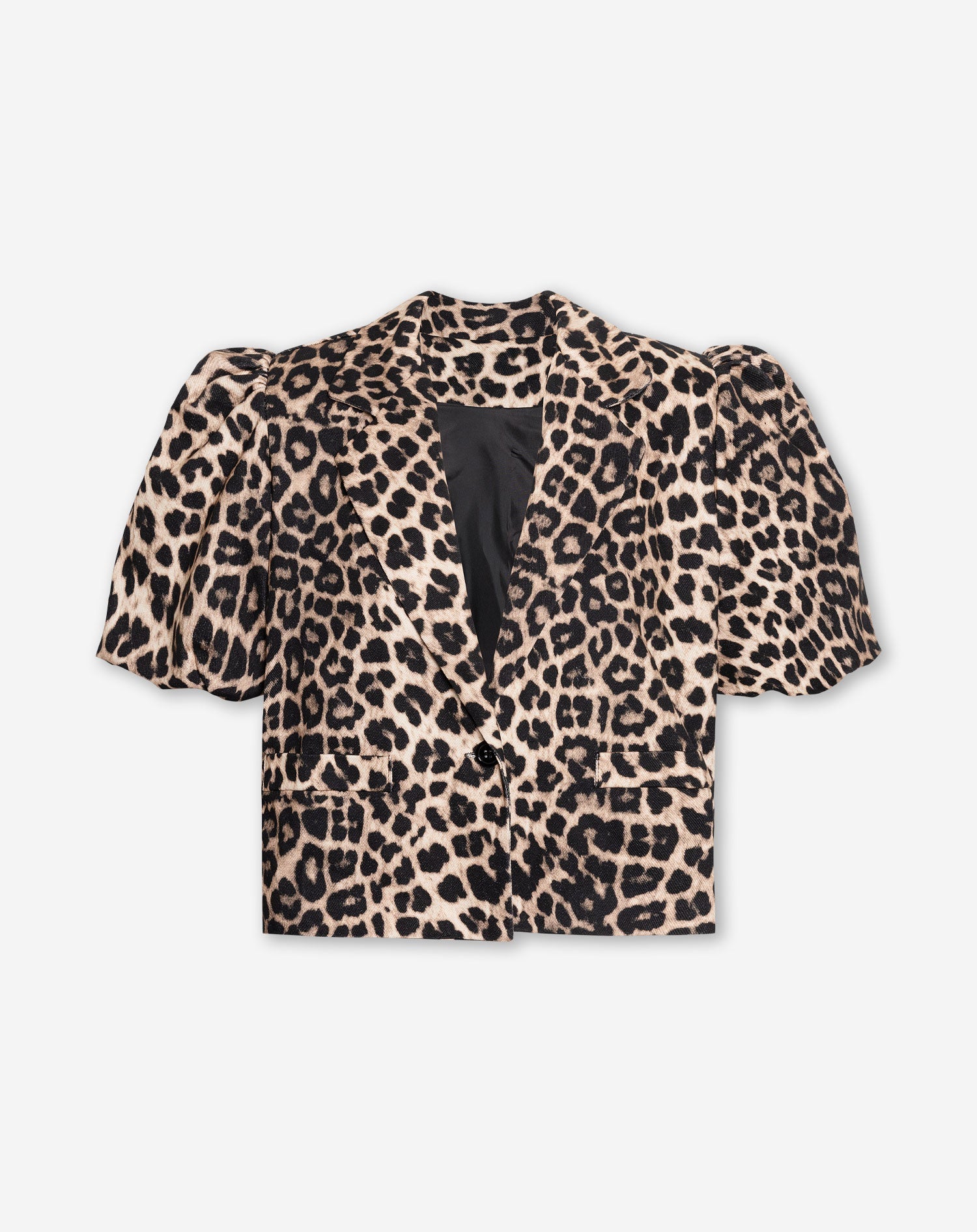 De blazer is gemaakt van een dikke, katoenen stof. De blazer heeft een leopard print en heeft een kortere lengte. De blazer heeft pofmouwen en schoudervulling.
