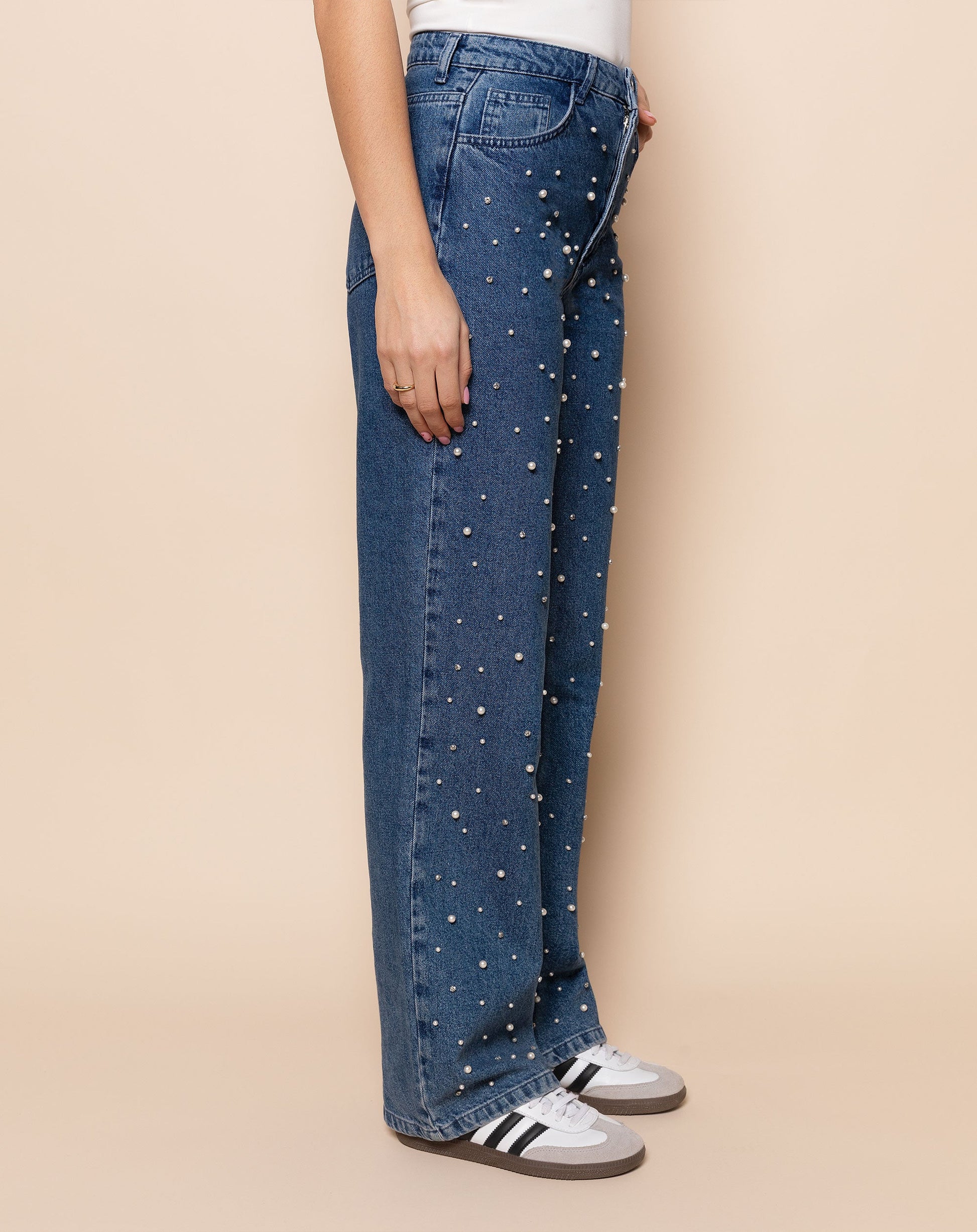 De broek is gemaakt van een donkerblauwe denim stof. De broek heeft zakken aan de voor- en achterkant. De broek heeft een mix van parels en diamantjes aan de voorkant. Combineer de broek met de bijpassende jacket voor een trendy co-ord look.