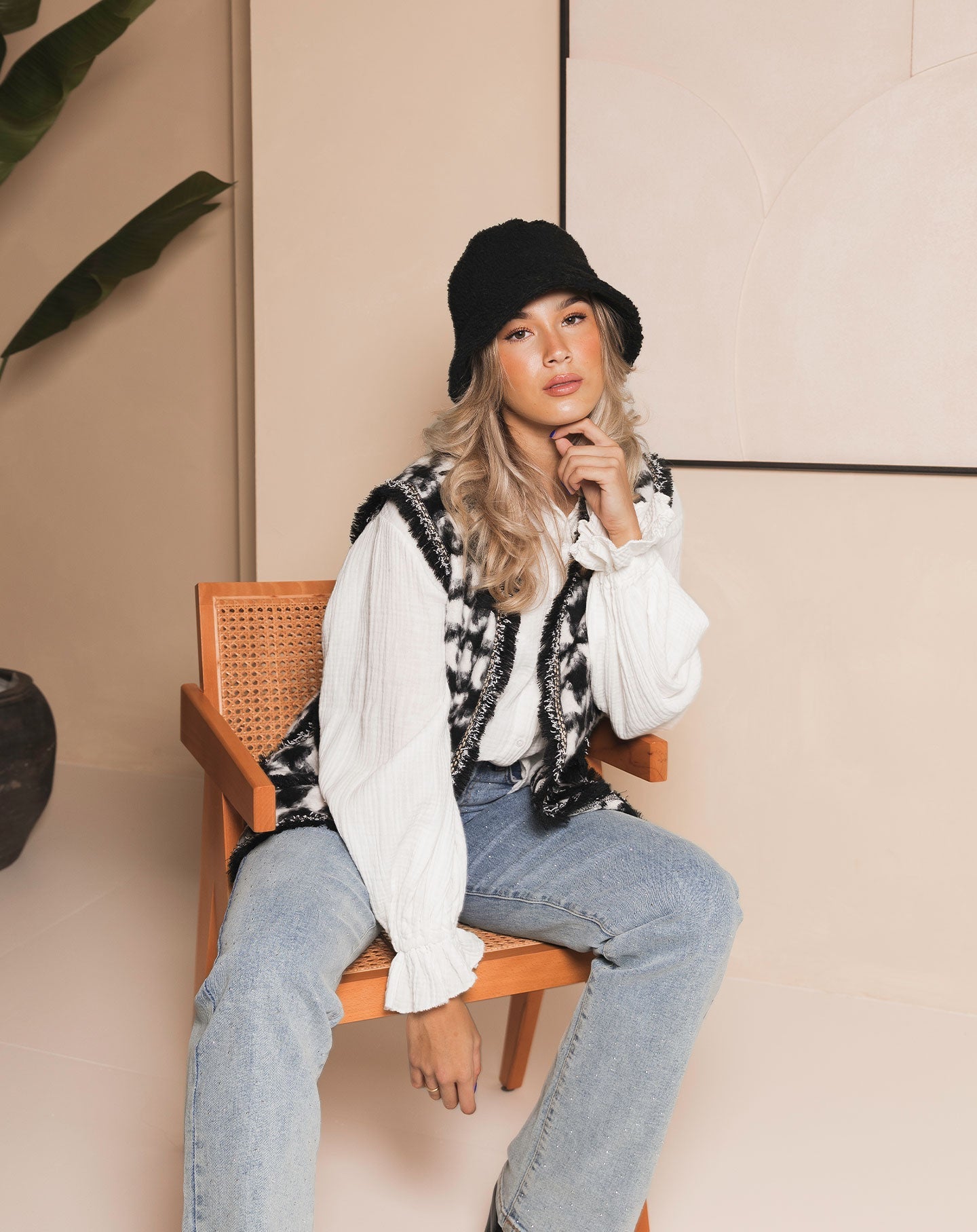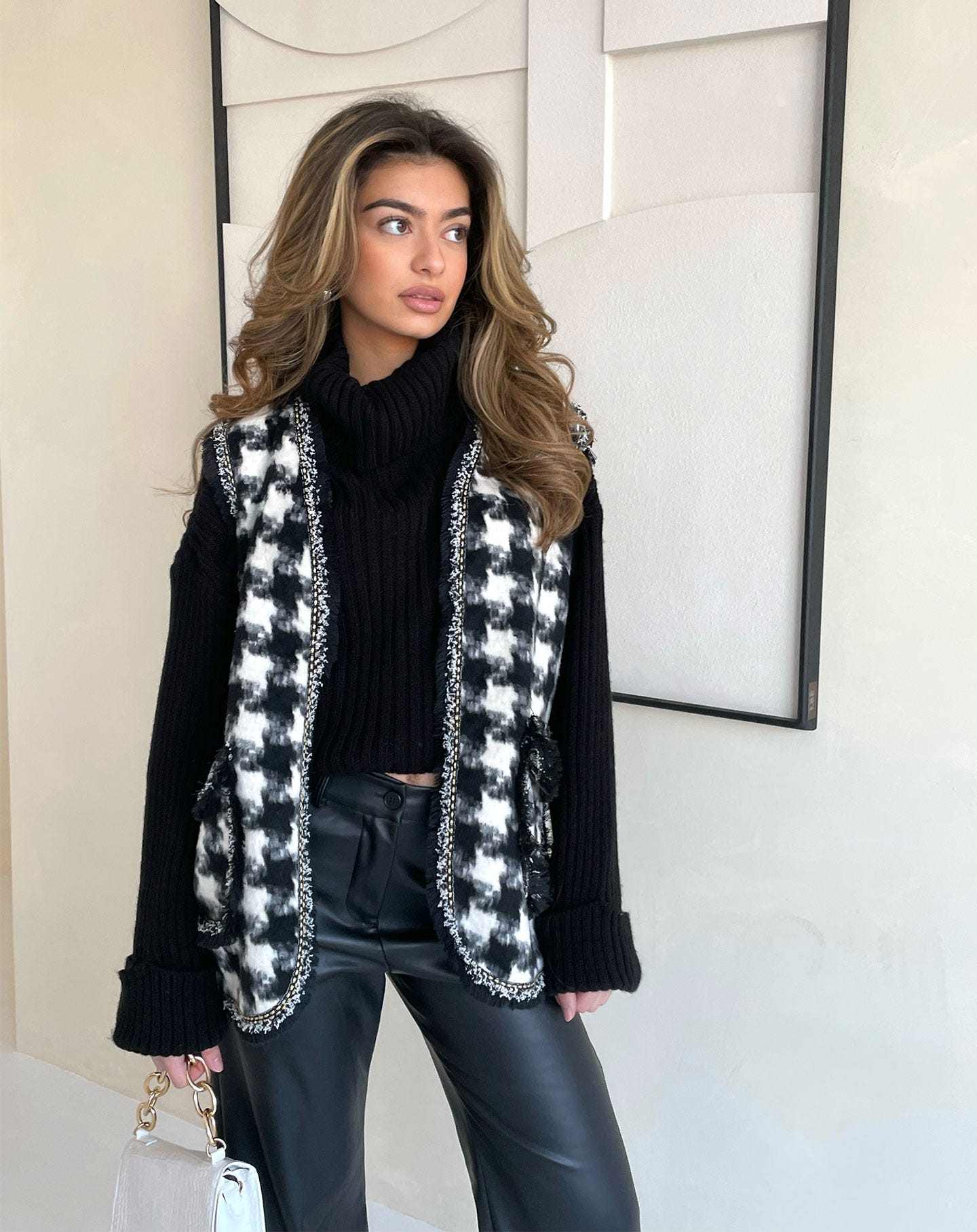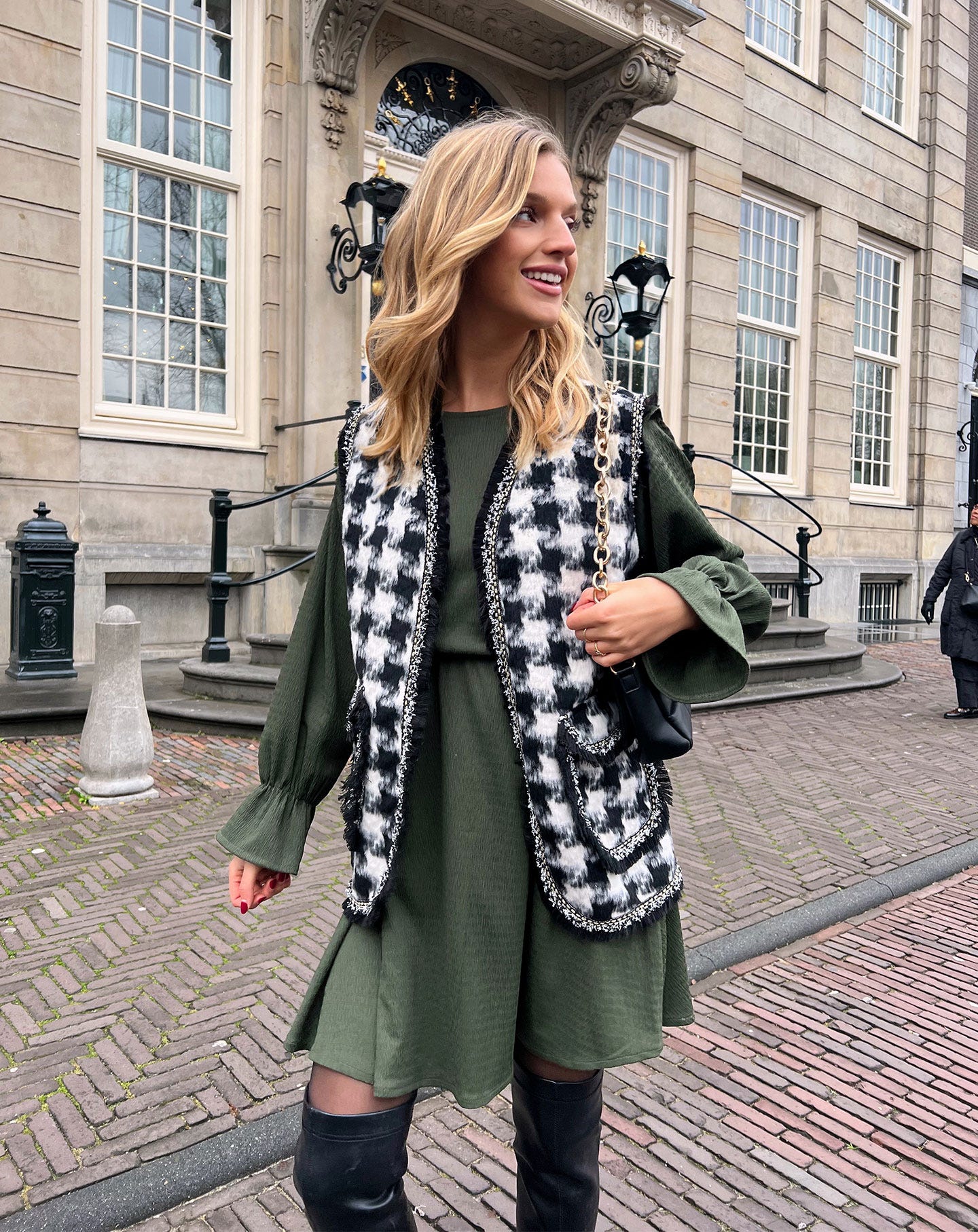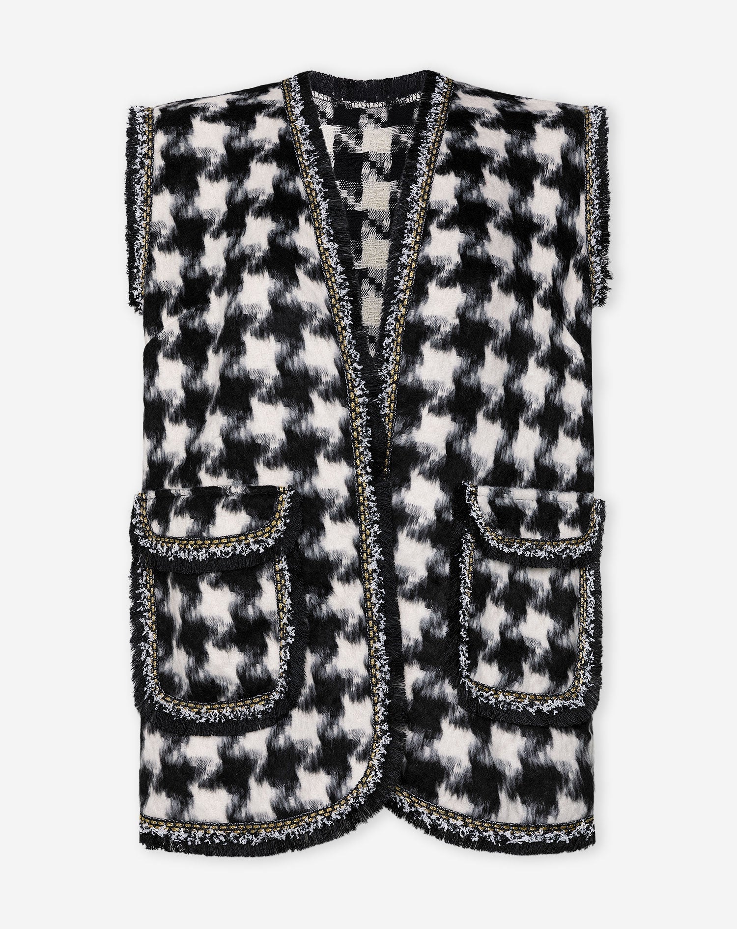 Dit gilet mag zeker niet ontbreken in jouw kledingkast! De gilet heeft een pied de poule print en heeft gouden details. Combineer het item met de Mousseline Blouse voor een trendy fall look.