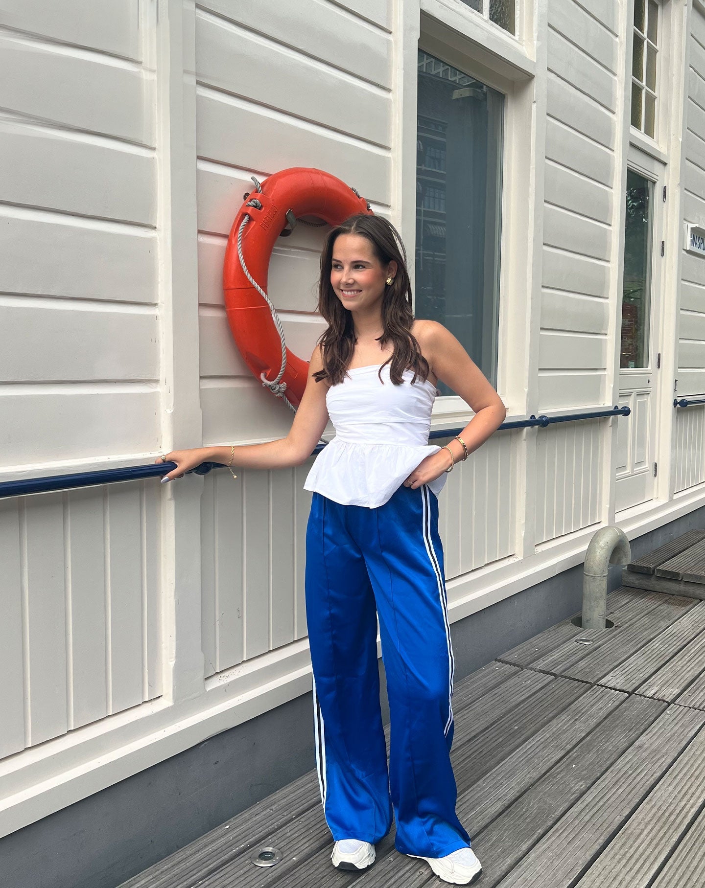 Dit is de tall variant, perfect voor als je wat langer bent. De broek is gemaakt van een blauwe, satijnen stof. De broek heeft een tape streep aan beide zijkanten, een pintuck streep aan de voorkant en een elastieken band rond het middel.