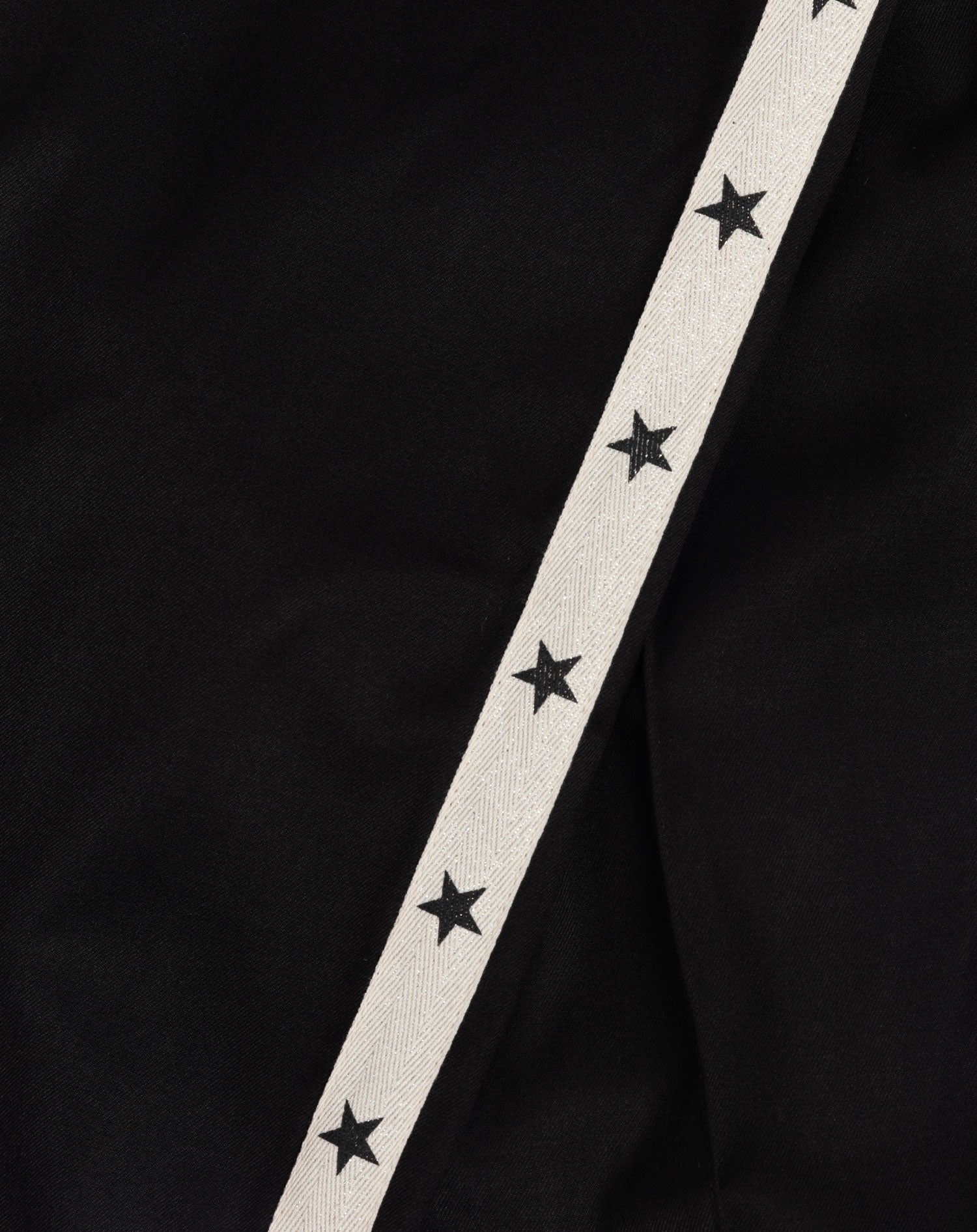 De pantalon heeft een elastieken band rond het middel, wijde pijpen en heeft een pintuck aan beide pijpen. De pantalon heeft een lichte lurex streep met een sterren print aan beide kanten.