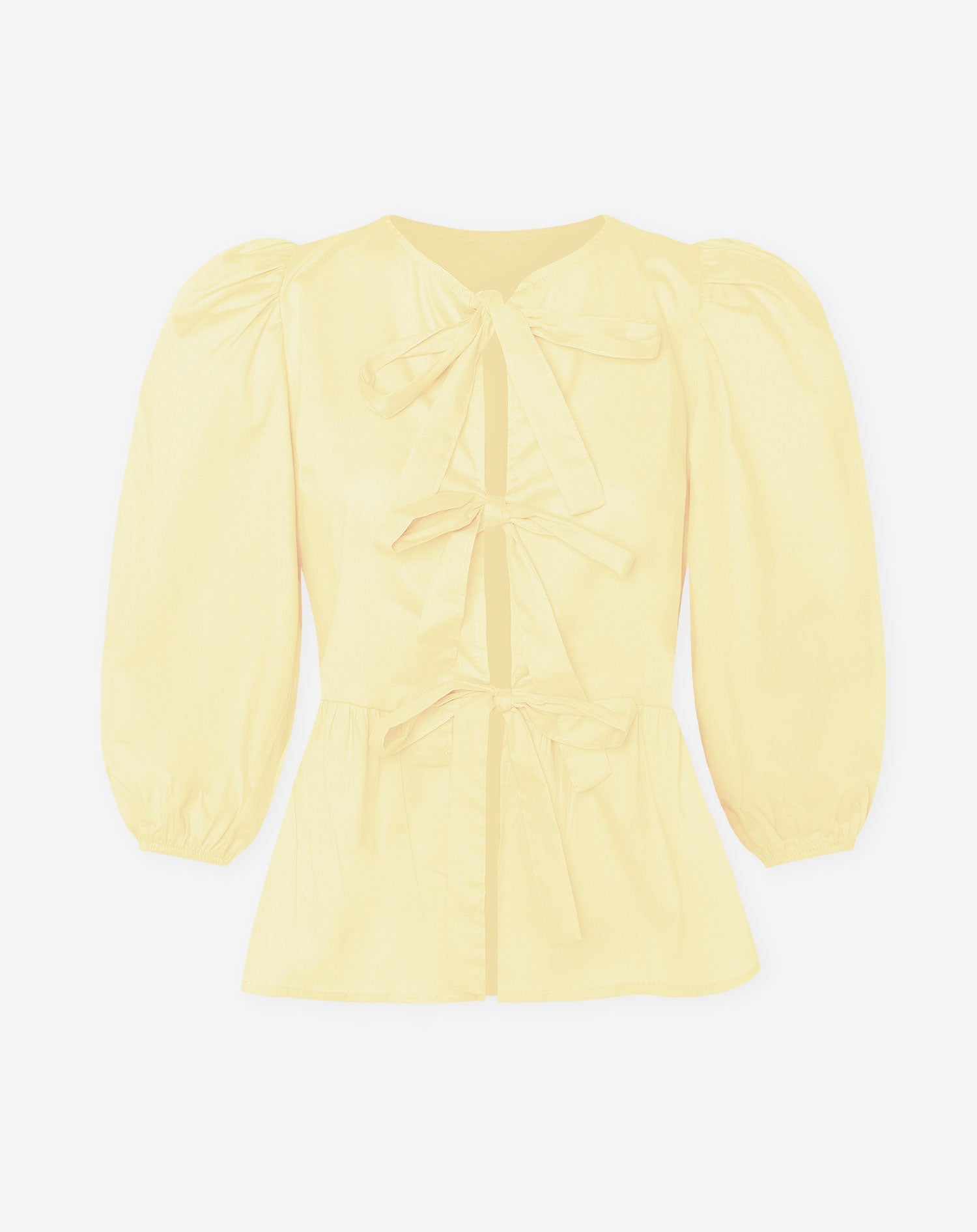 De top is gemaakt van een botergele, poplin stof. De top heeft strikjes in het midden die jezelf vaststrikt waardoor deze perfect past bij de bow trend van dit moment.