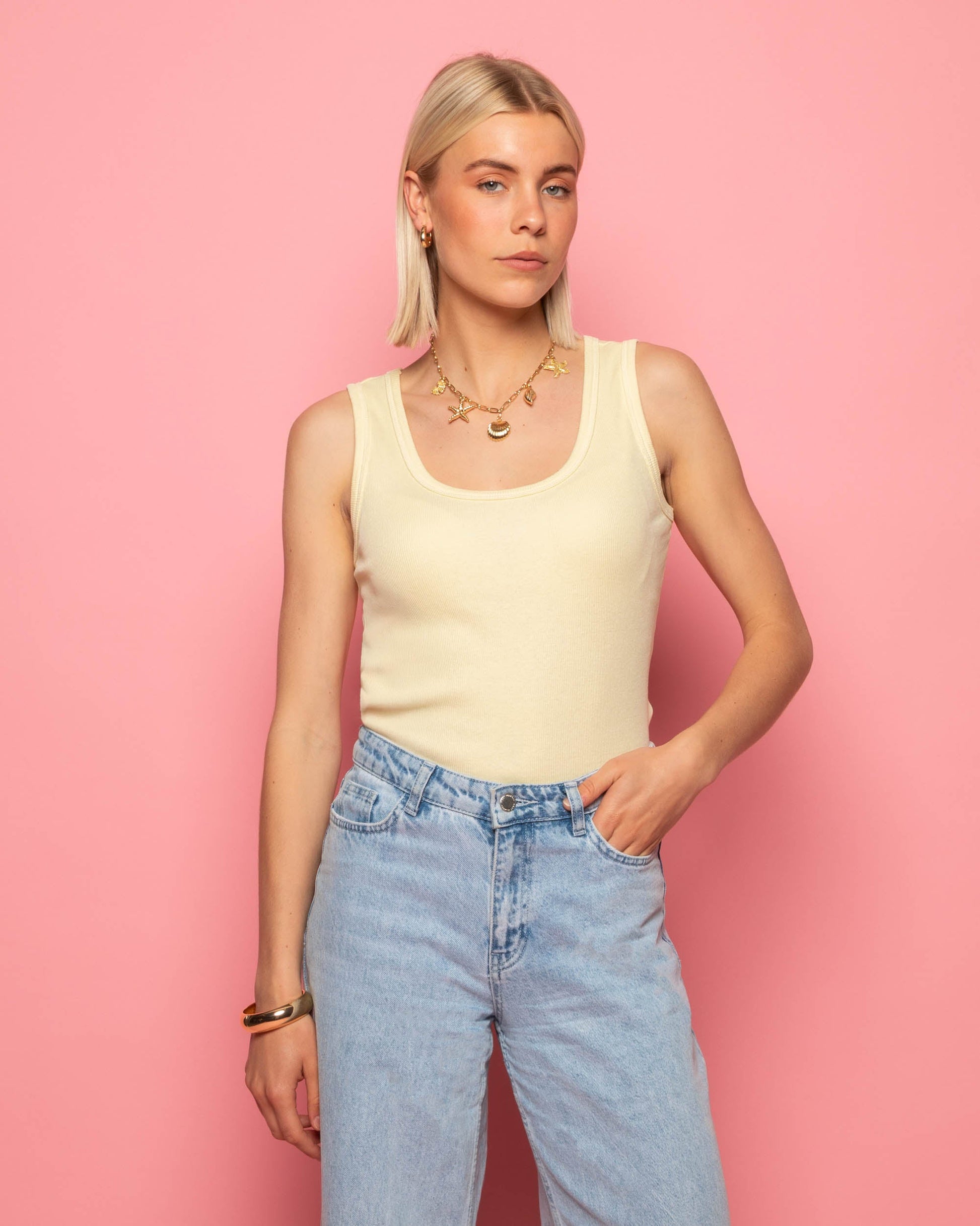 De top is gemaakt van een geribbeld, katoenen stof in de kleur butter yellow. De top heeft stretch, waardoor deze mooi aansluit.