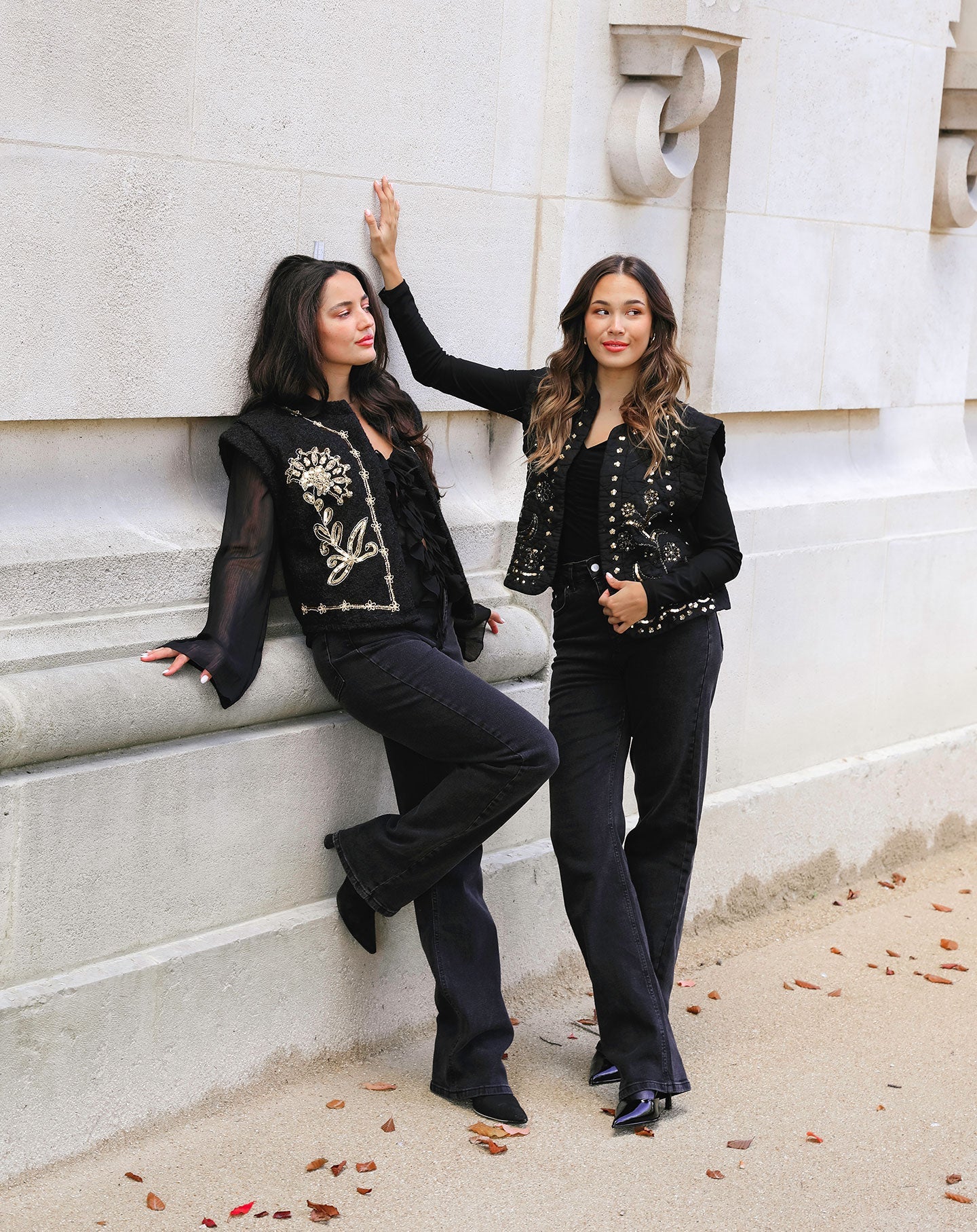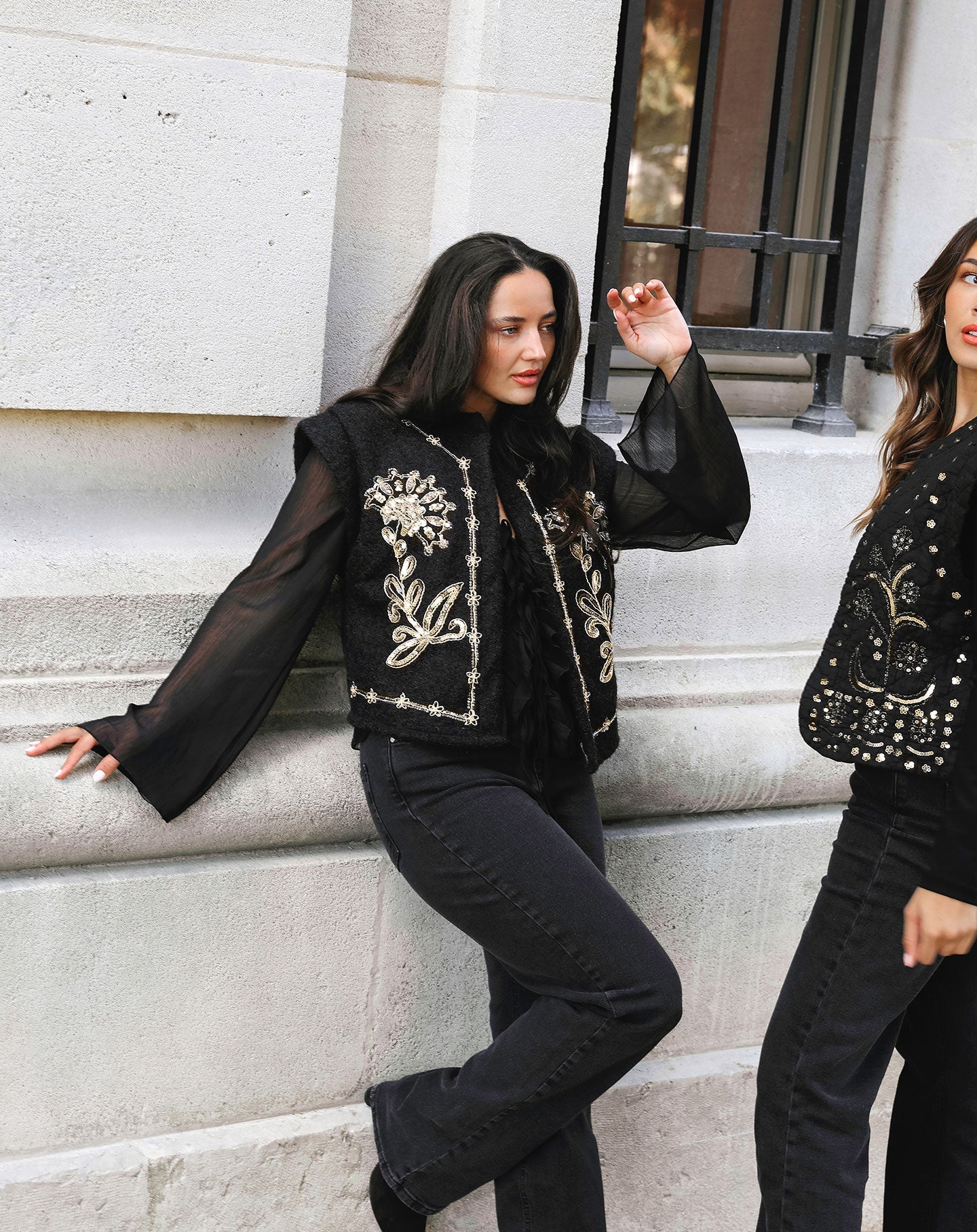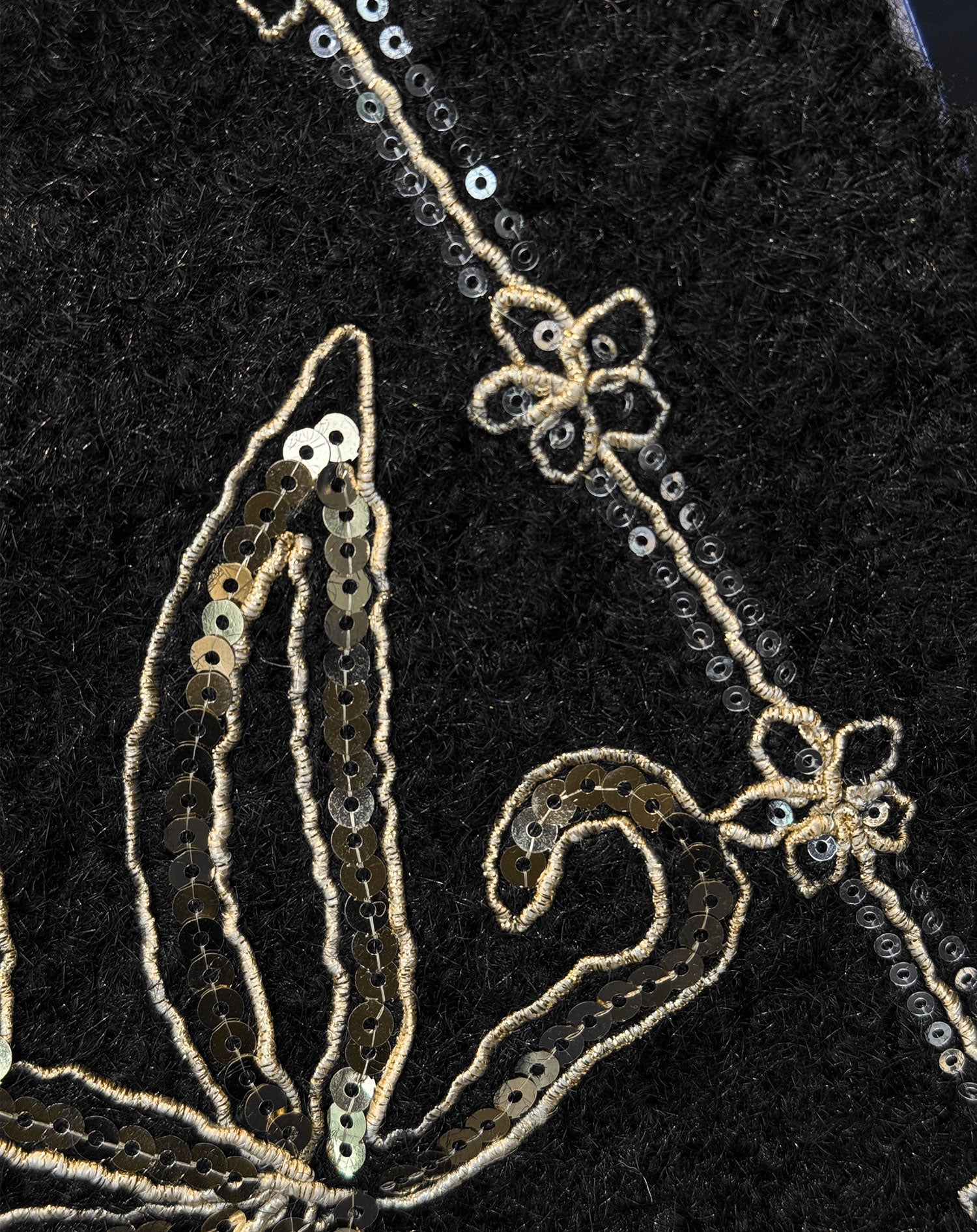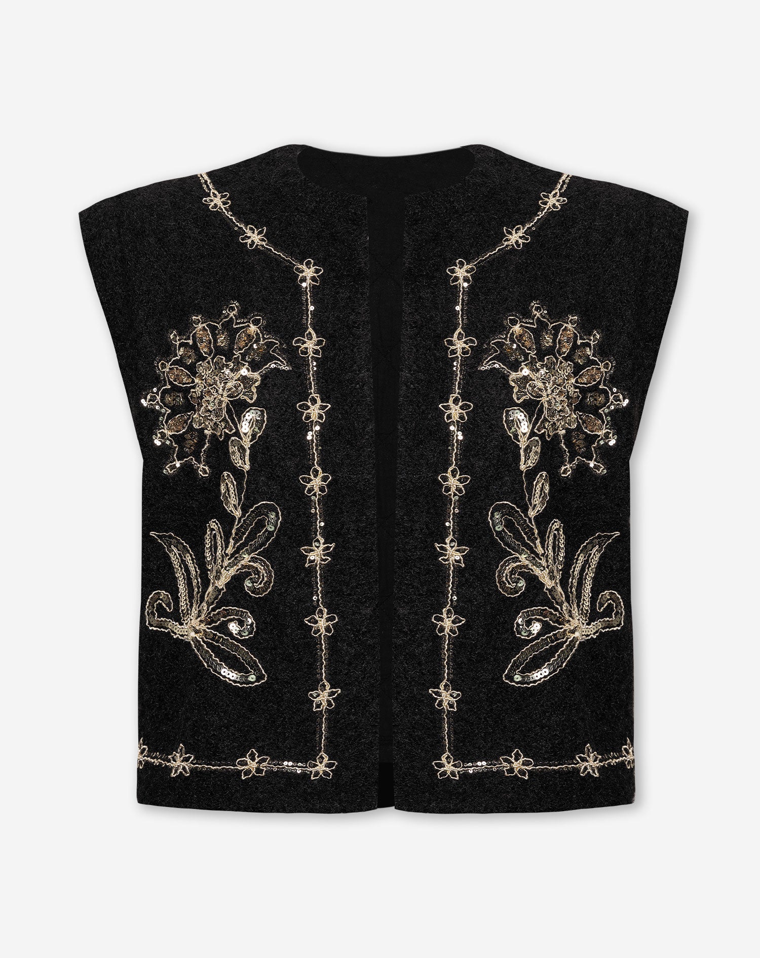 Het gilet is gemaakt van een zachte, dikke stof en is voorzien van een geborduurde print met zilver- en goudkleurige pailletten.