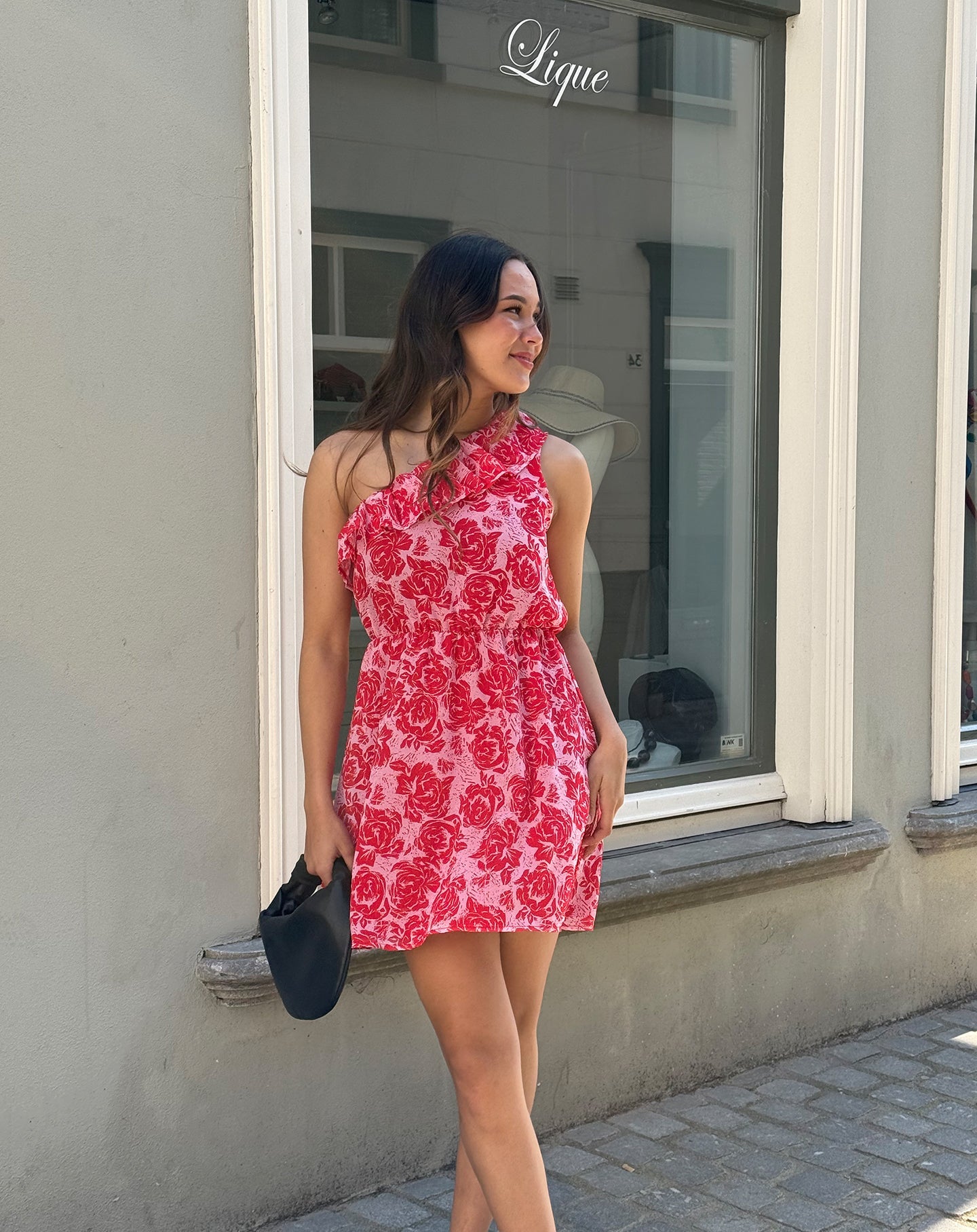 Het jurkje is gevoerd en heeft een zomers bloemen printje. Het jurkje heeft een one shoulder model en heeft elastiek aan de bovenkant en rond het middel.