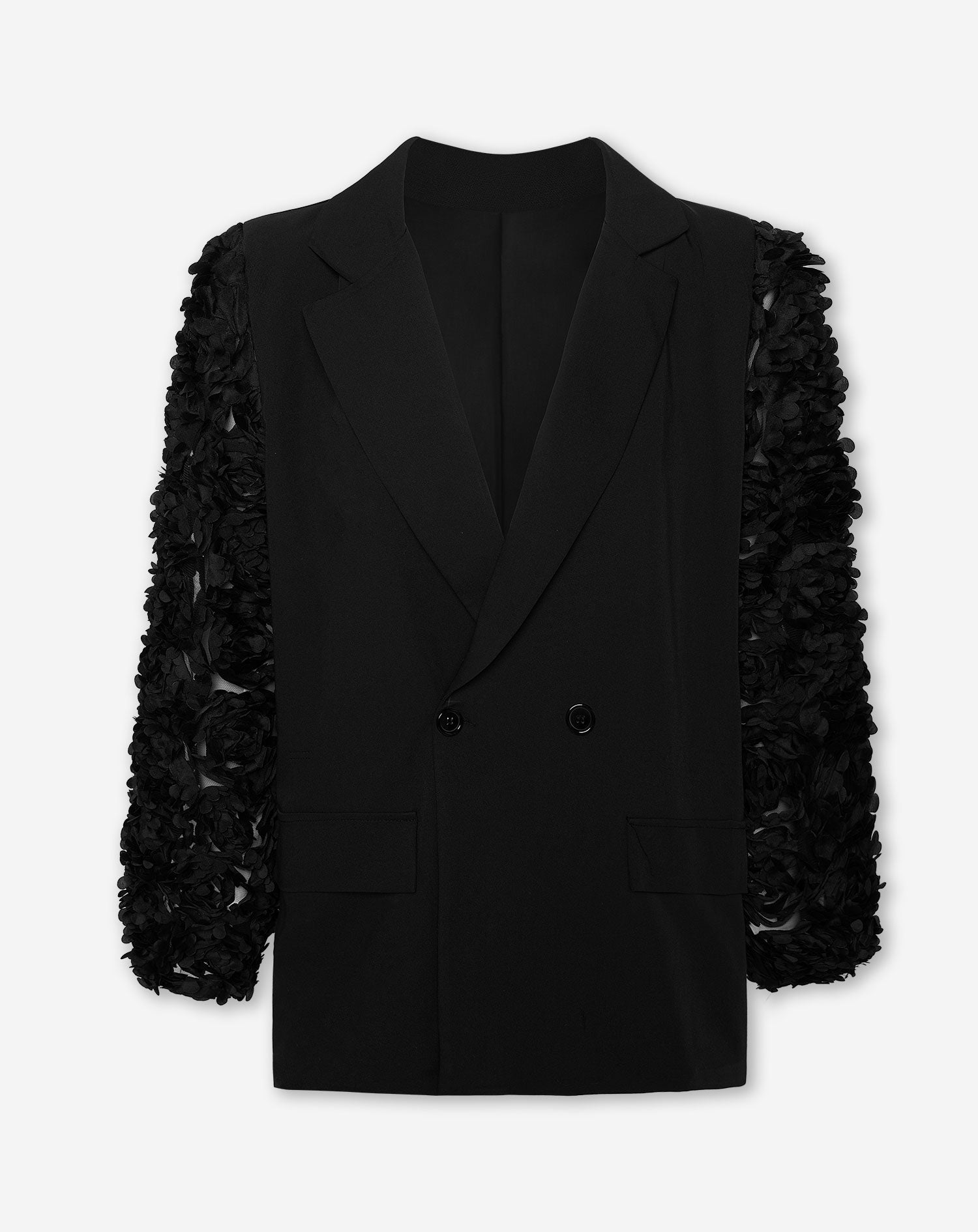 De blazer is gemaakt van een zwarte, plain stof. De blazer is gevoerd en heeft een knoopsluiting. De blazer heeft schoudervulling en heeft 2 imitatiezakken aan de voorkant. De blazer heeft prachtige, rozen mouwen waardoor deze een unieke look heeft.