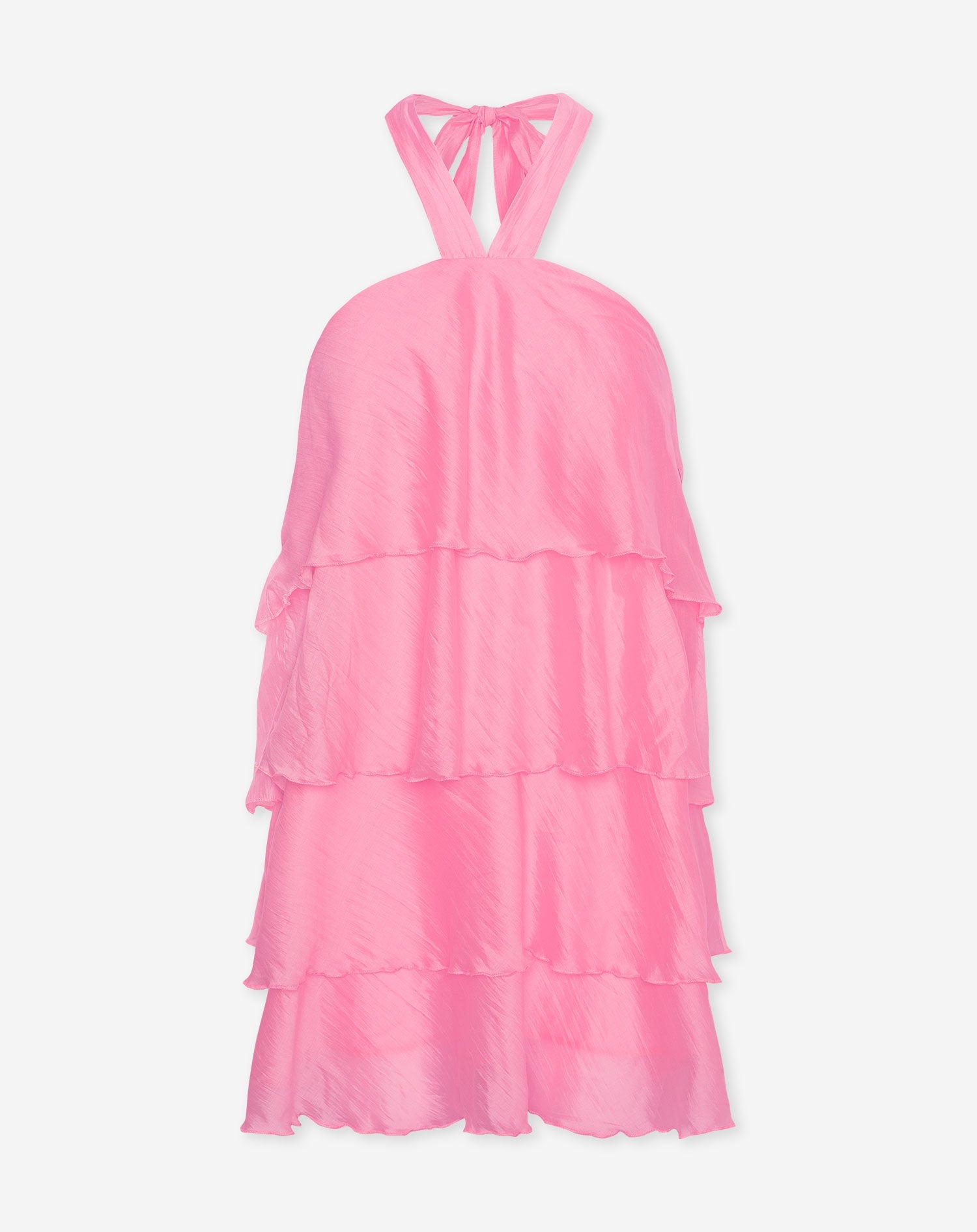 De jurk is gemaakt van een glimmende, kleurrijke stof. De jurk heeft een halter model en heeft meerdere lagen met ruffles waardoor dit het perfecte jurkje is voor de zomer. De jurk heeft een elastieken band op de rug.