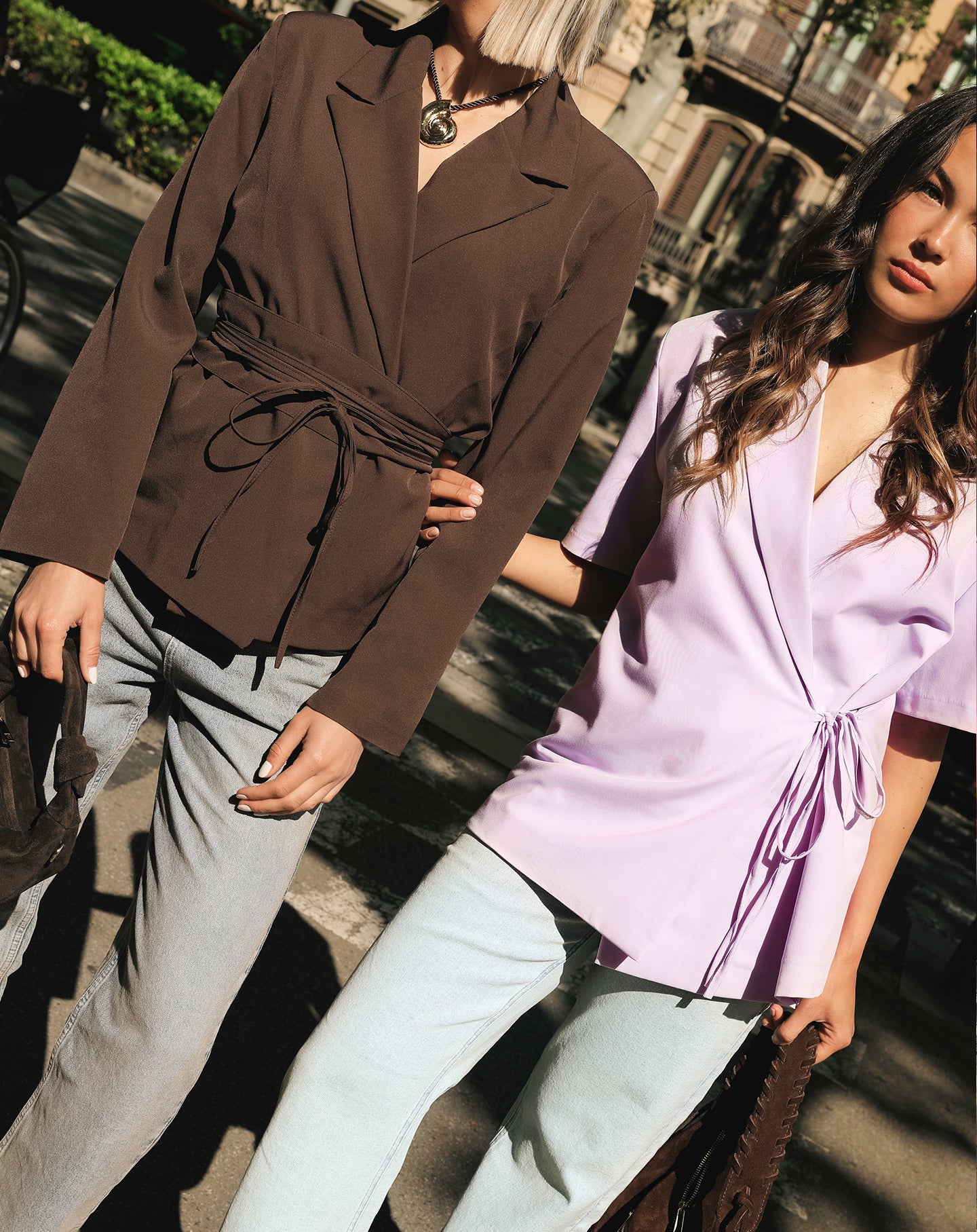 De blazer is gemaakt van een plain donkerbruine stof. De blazer komt met een los ceintuur met daaraan 2 touwtjes waardoor de blazer een unieke look heeft. De blazer heeft schoudervulling.