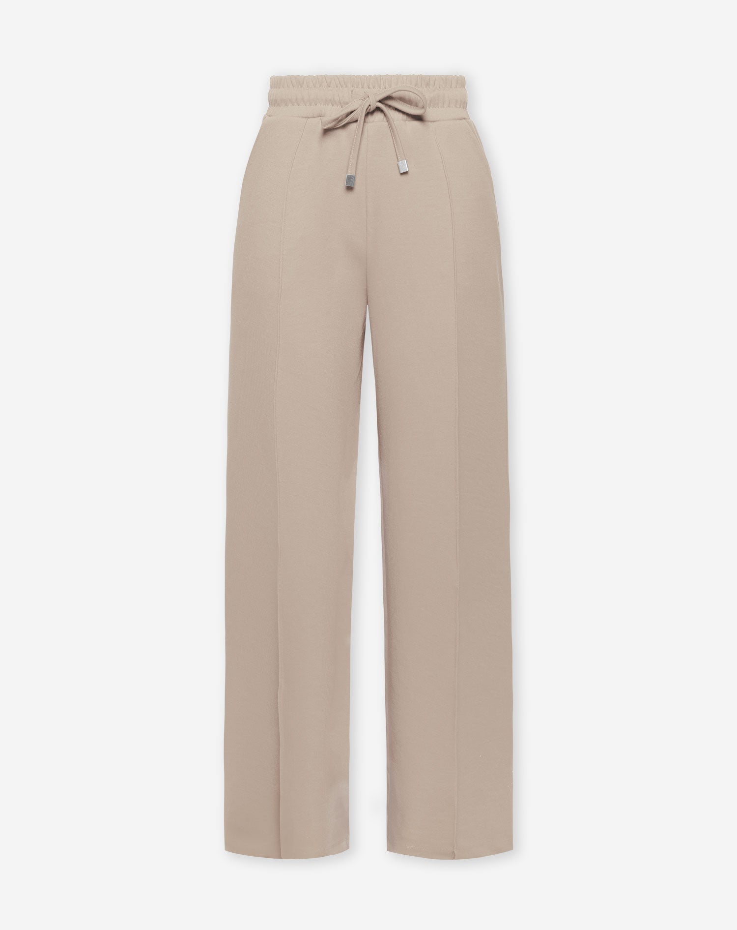 De broek is gemaakt van een comfortabele, viscose stof. De broek heeft een elastieken band die je zelf strakker kunt maken. De broek heeft een pintuck op beide broekspijpen.