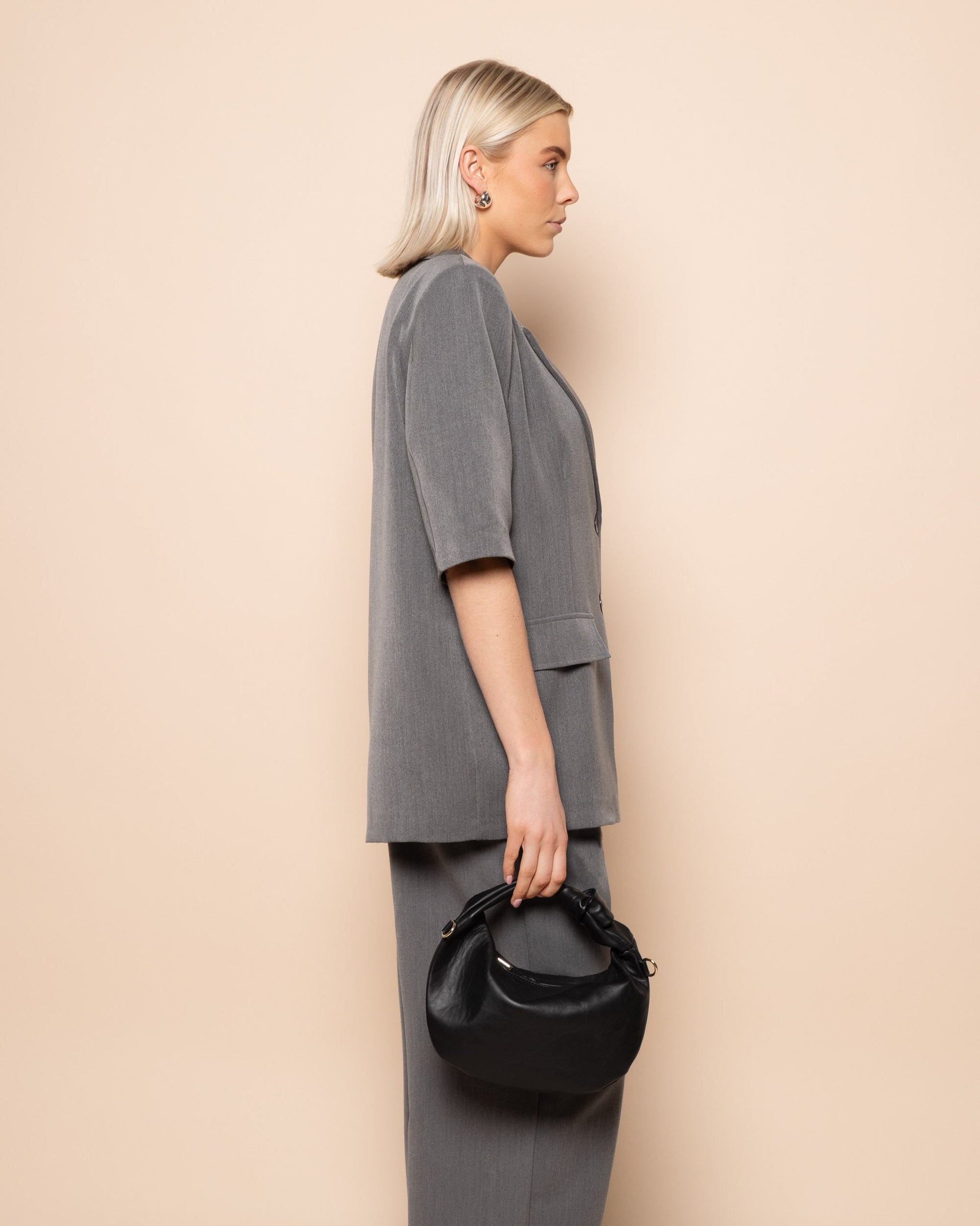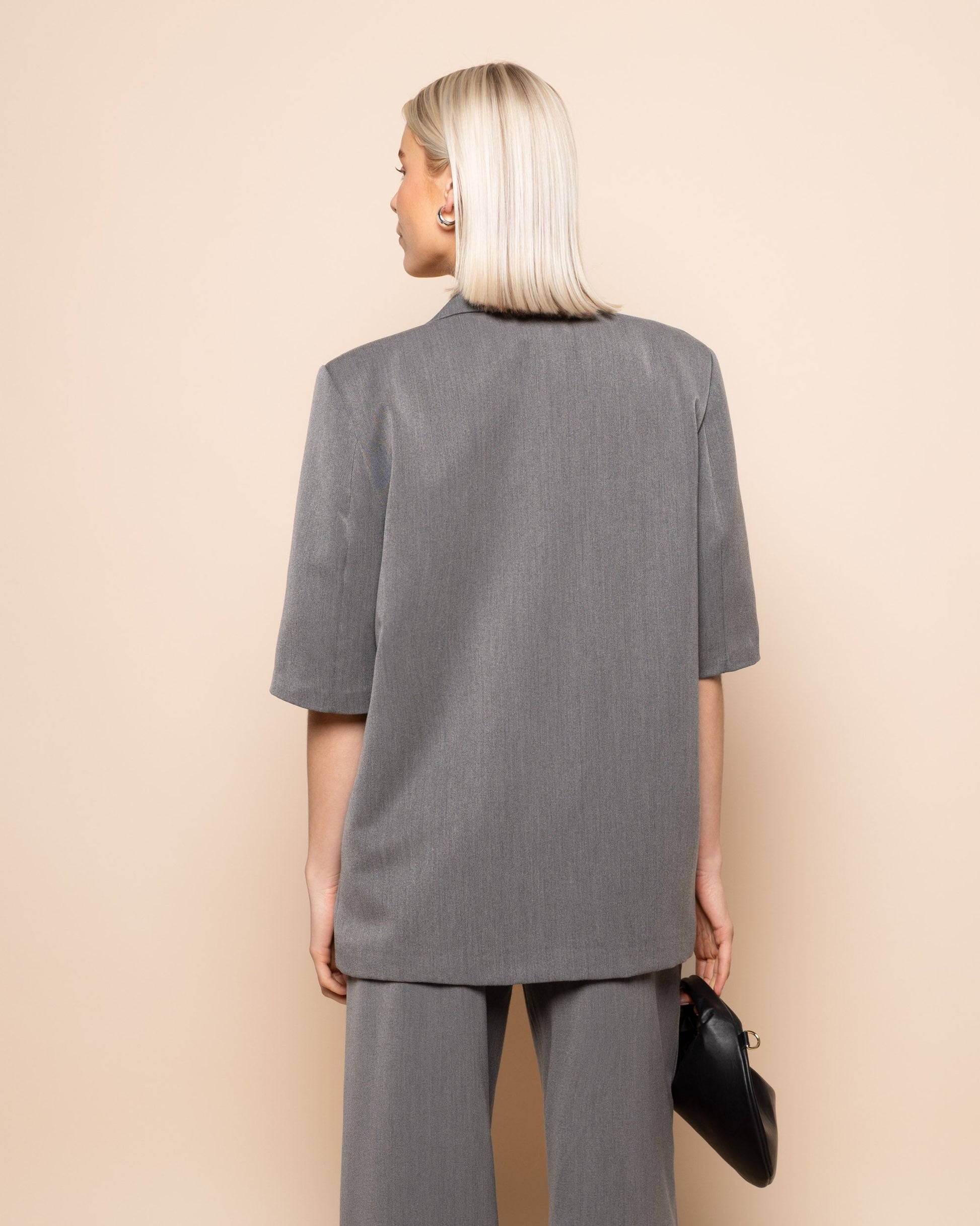 De blazer is gemaakt van een grijze melange stof. De blazer heeft schoudervulling en de blazer is gevoerd. De blazer heeft korte mouwen en heeft imitatiezakken aan de voorkant.