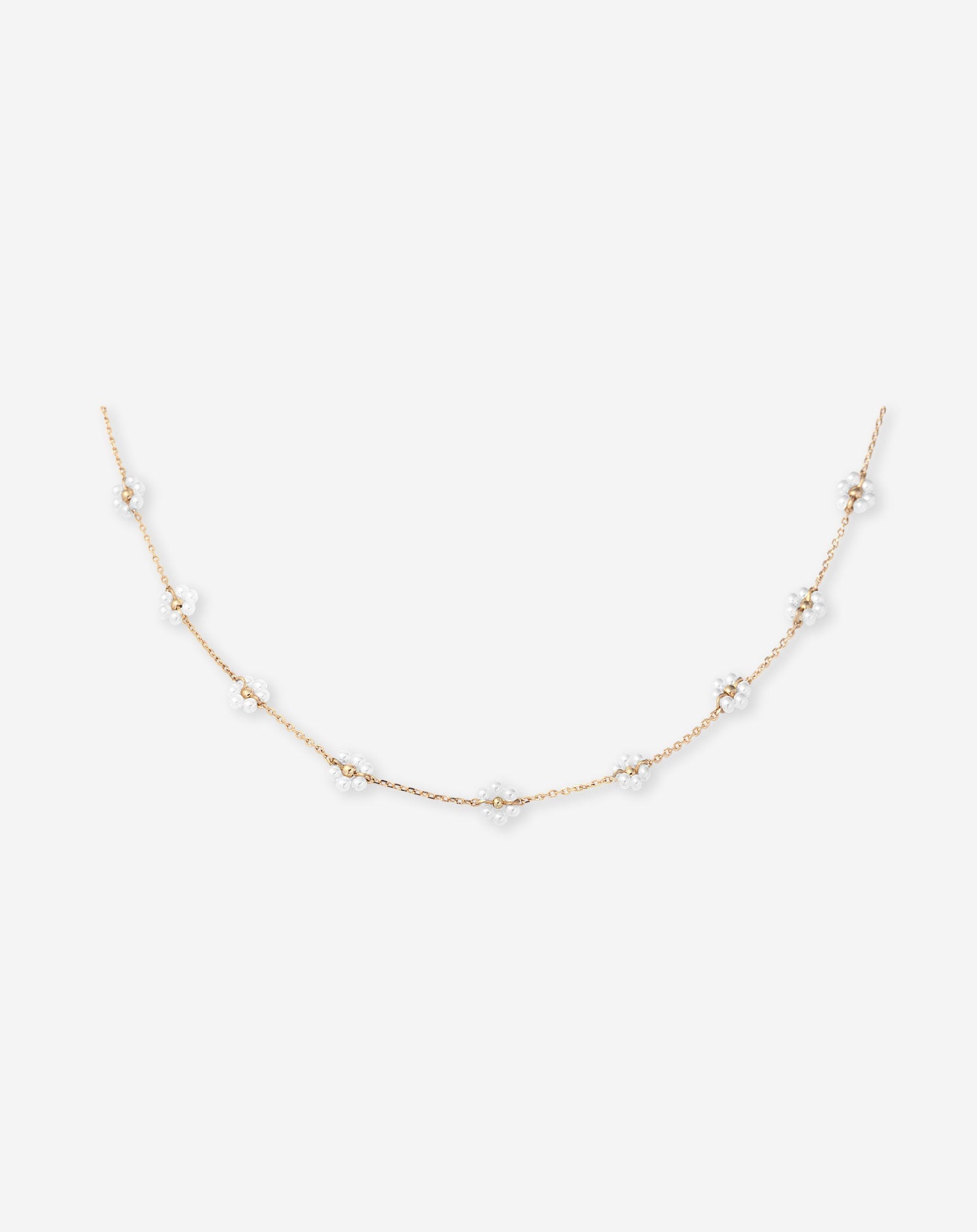 De ketting is goudkleurig en heeft kleine kralen, in de vorm van bloemetjes.