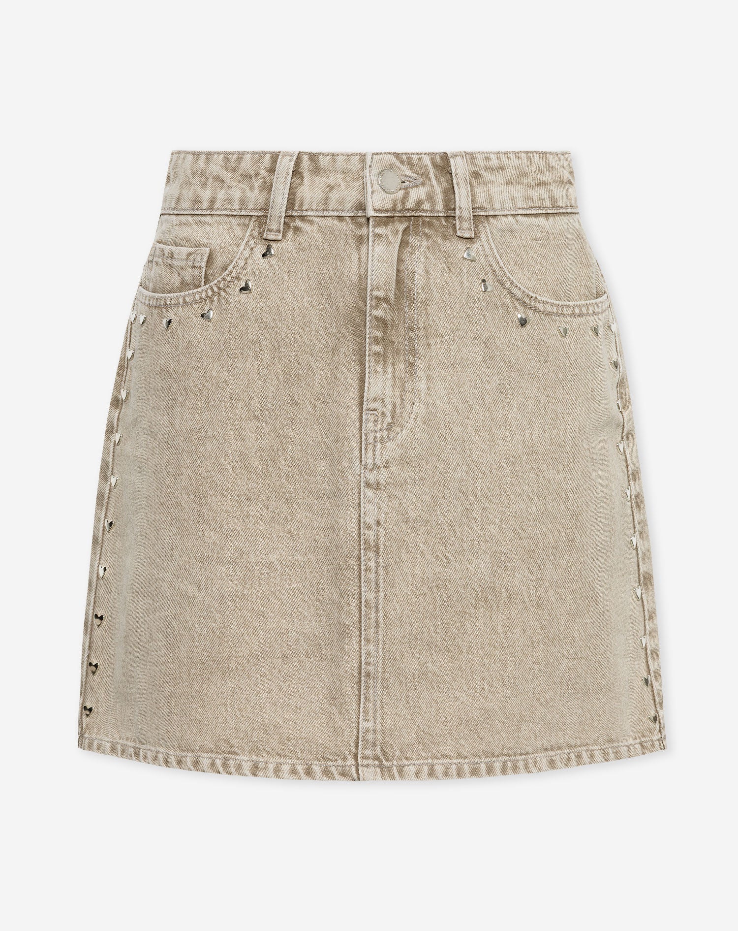 De skirt is gemaakt van een beige denim stof en heeft zilverkleurige studs in de vorm van hartjes.