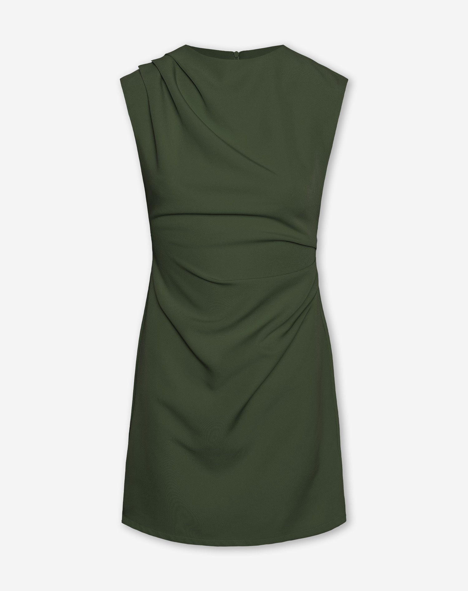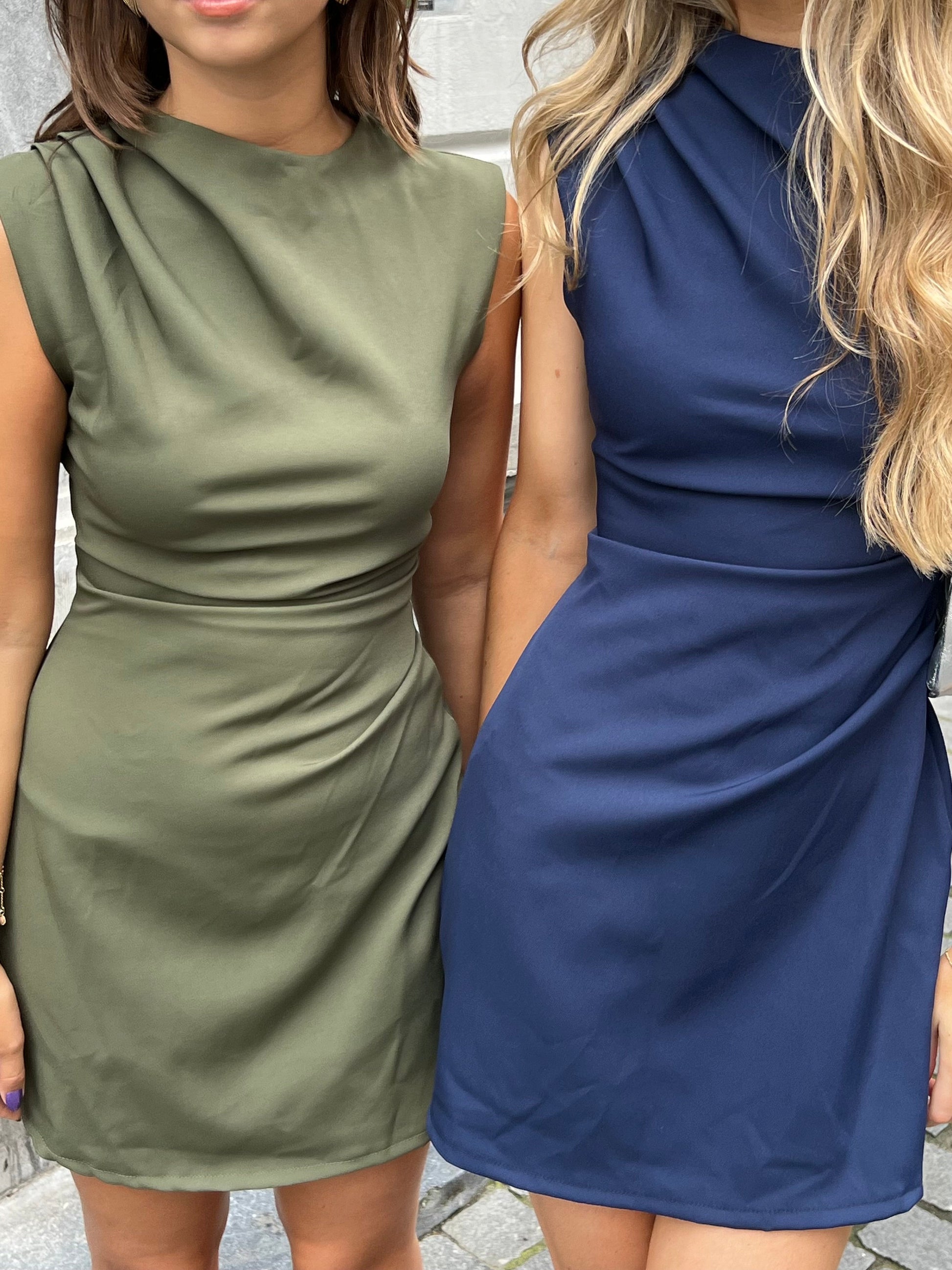 Het jurkje is gemaakt van een wat dikkere stof. Het jurkje heeft een ronde hals, is geruched en heeft een ritssluiting aan de achterkant.