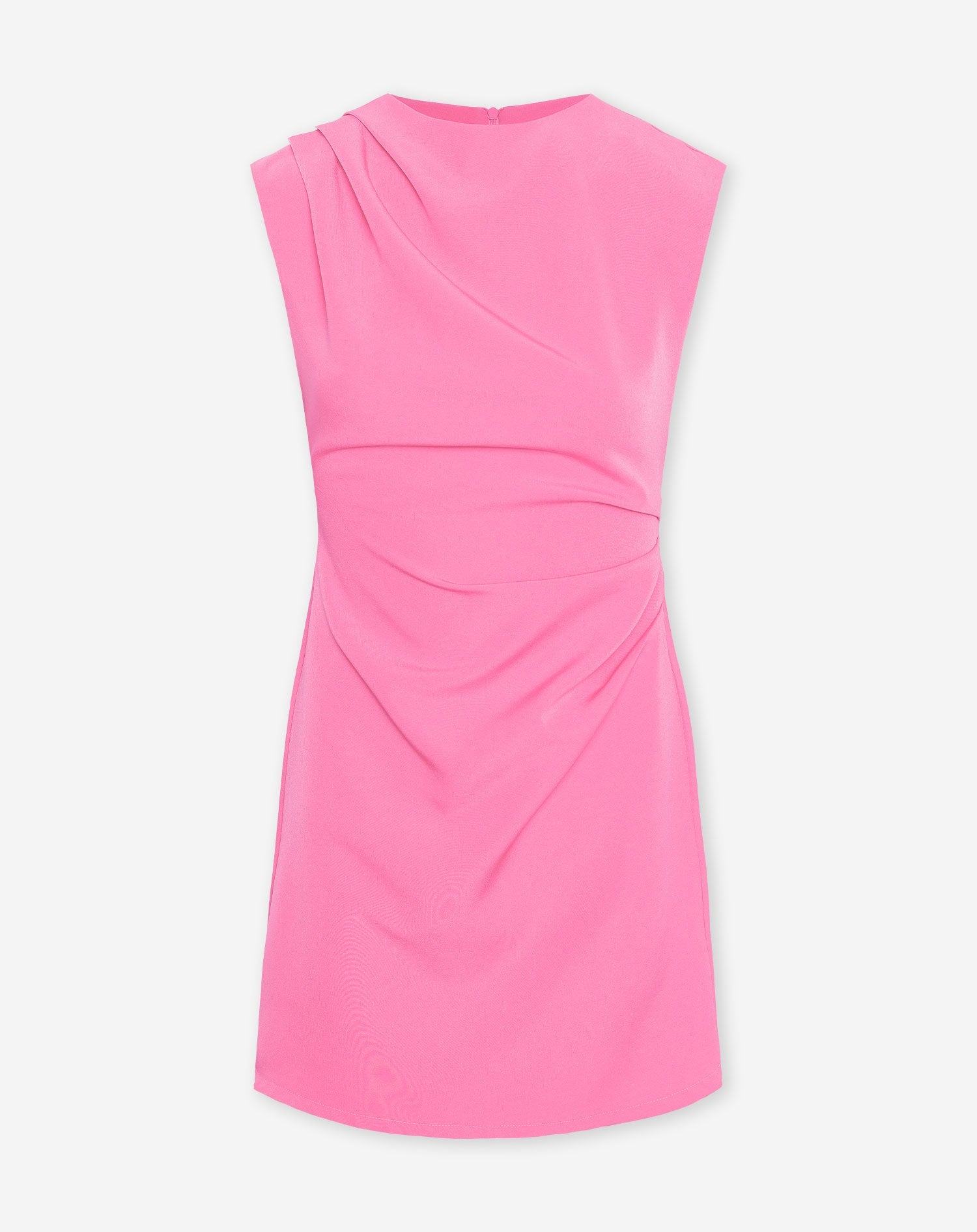 Het jurkje is gemaakt van een wat dikkere stof. Het jurkje heeft een ronde hals, is geruched en heeft een ritssluiting aan de achterkant.
