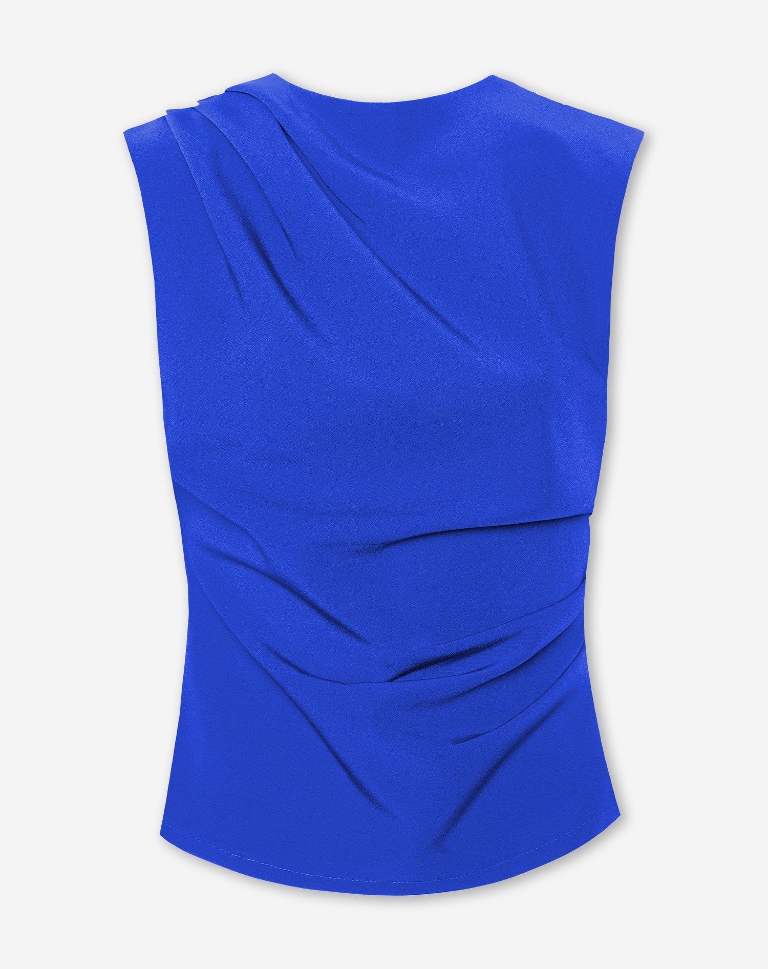 De top is gemaakt van een comfortabele stof en is geruched waardoor deze een unieke look heeft. De top heeft een knoopjessluiting in de nek en een ritssluiting aan de zijkant.
