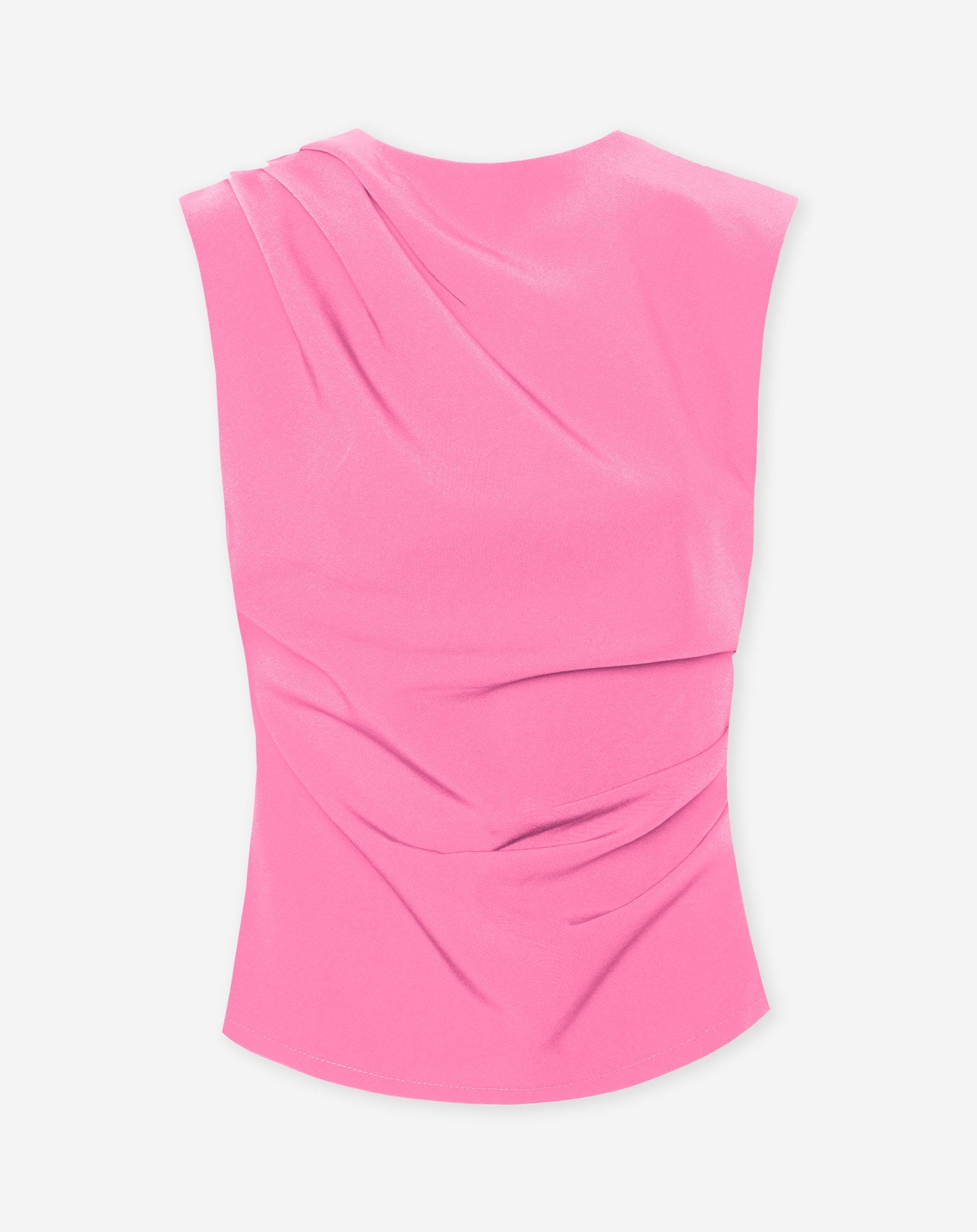 De top is gemaakt van een comfortabele stof en is geruched waardoor deze een unieke look heeft. De top heeft een knoopjessluiting in de nek en een ritssluiting aan de zijkant.