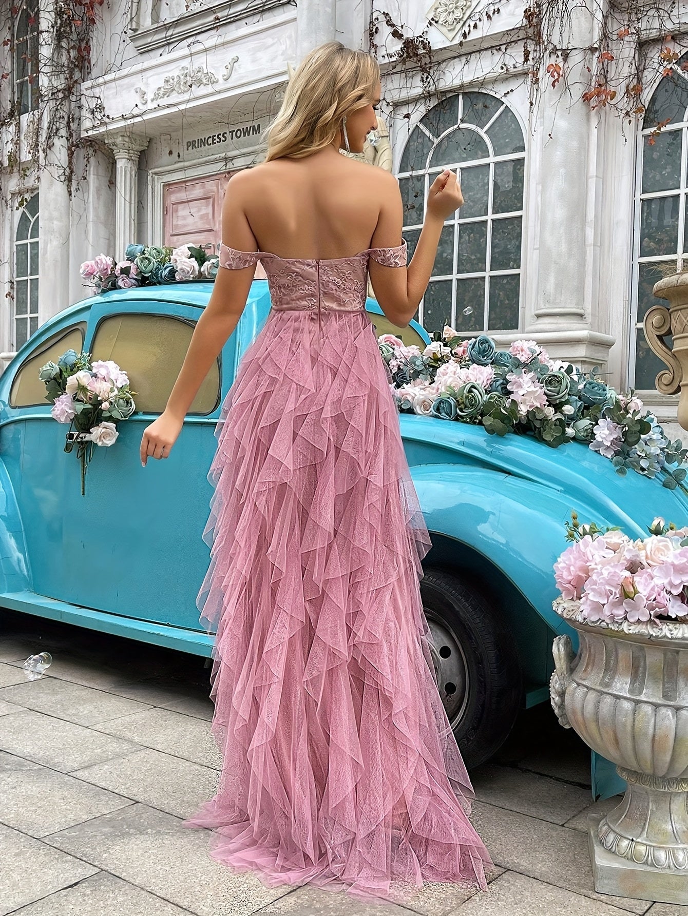 Deze off-shoulder jurk met een verfijnde kanten bovenkant en een luchtige tulle rok is de perfecte keuze voor een speciale gelegenheid. De hoge split voegt een vleugje glamour toe, terwijl de speelse laagjes zorgen voor een romantische uitstraling. Of je nu naar een gala, bruiloft of chic diner gaat, met deze jurk ben je gegarandeerd het stralende middelpunt. Bestel jouw favoriet vandaag nog bij Mowa-Mode!