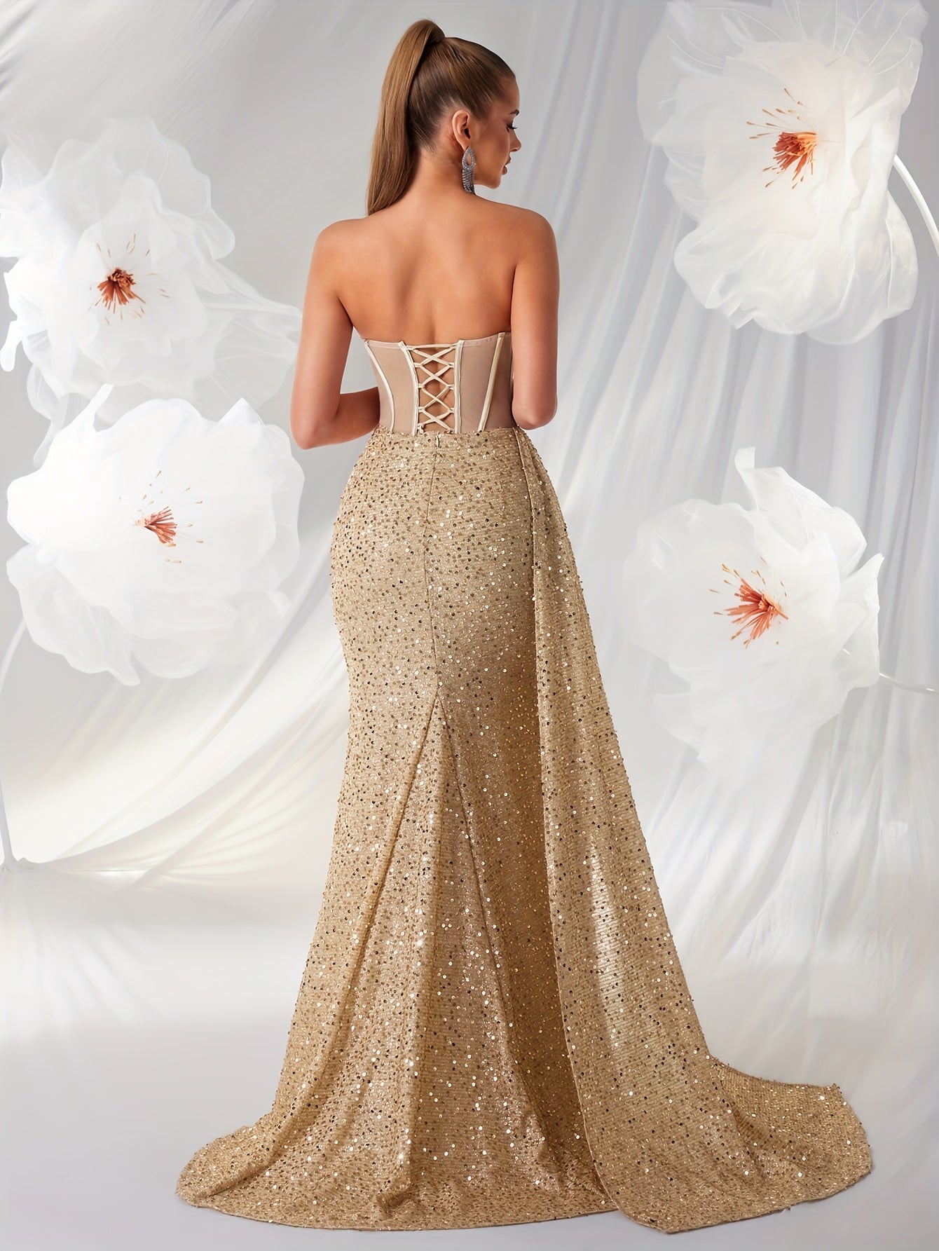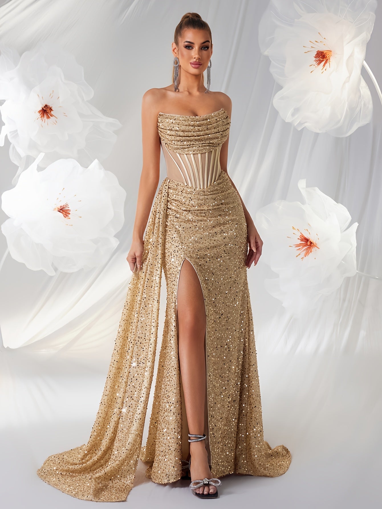 Deze adembenemende avondjurk combineert een verfijnde strapless halslijn met een transparante, korsetachtige taille die je silhouet perfect accentueert. De glinsterende pailletten en elegante split geven je een verleidelijke look, ideaal voor gala’s en exclusieve feesten. Met deze jurk van Mowa-Mode ben jij gegarandeerd het stralende middelpunt van elke speciale gelegenheid.