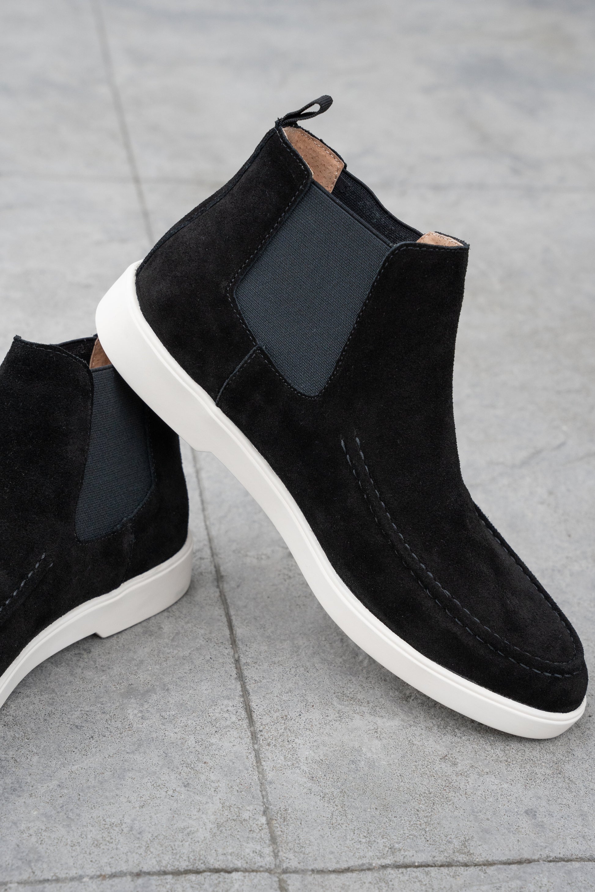 Ein zeitloses Design mit einem modernen Touch: Die hohen Loafer „Chelsea“ sind aus hochwertigem Wildleder gefertigt und verströmen einen klassischen Look. Diese hohen Loafer sind ein Must-Have für Männer, die ihr Outfit mit einem eleganten Loafer perfektionieren möchten. Das geschmeidige Wildleder passt sich mühelos Ihrem Fuß an, während die weiche Innensohle auch an langen Tagen für langanhaltenden Komfort sorgt. Durch die elastischen Einsätze ist ein einfaches An- und Ausziehen möglich, sodass Sie schnell aus der Tür gehen können. Die glatte weiße Sohle verleiht einen subtilen Touch und sorgt für einen modernen Look. Egal, ob Sie sie zu einer eleganten Hose oder einem lässigen Outfit tragen, diese Chelsea-Boots verleihen Ihrem Look mühelos das gewisse Etwas.