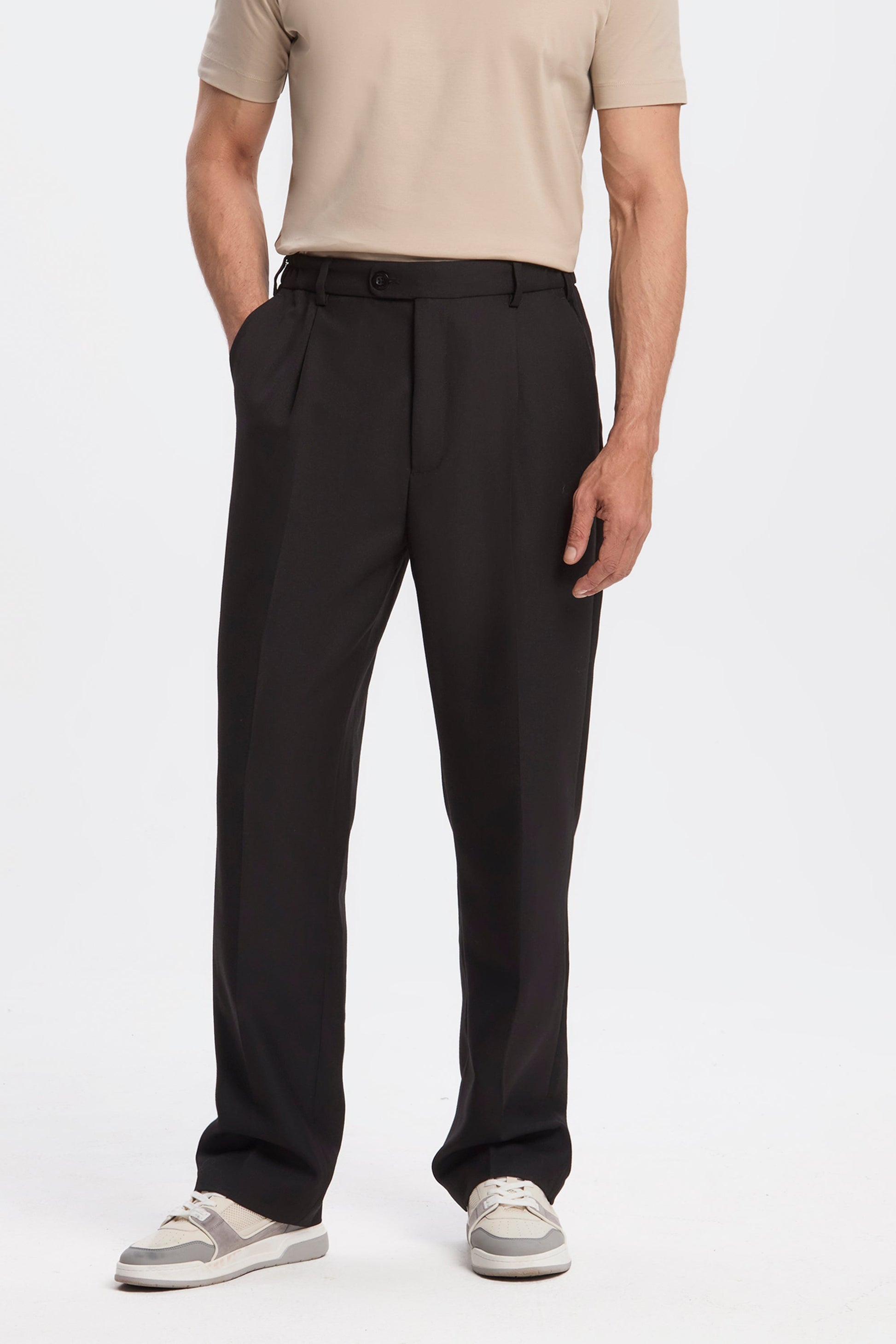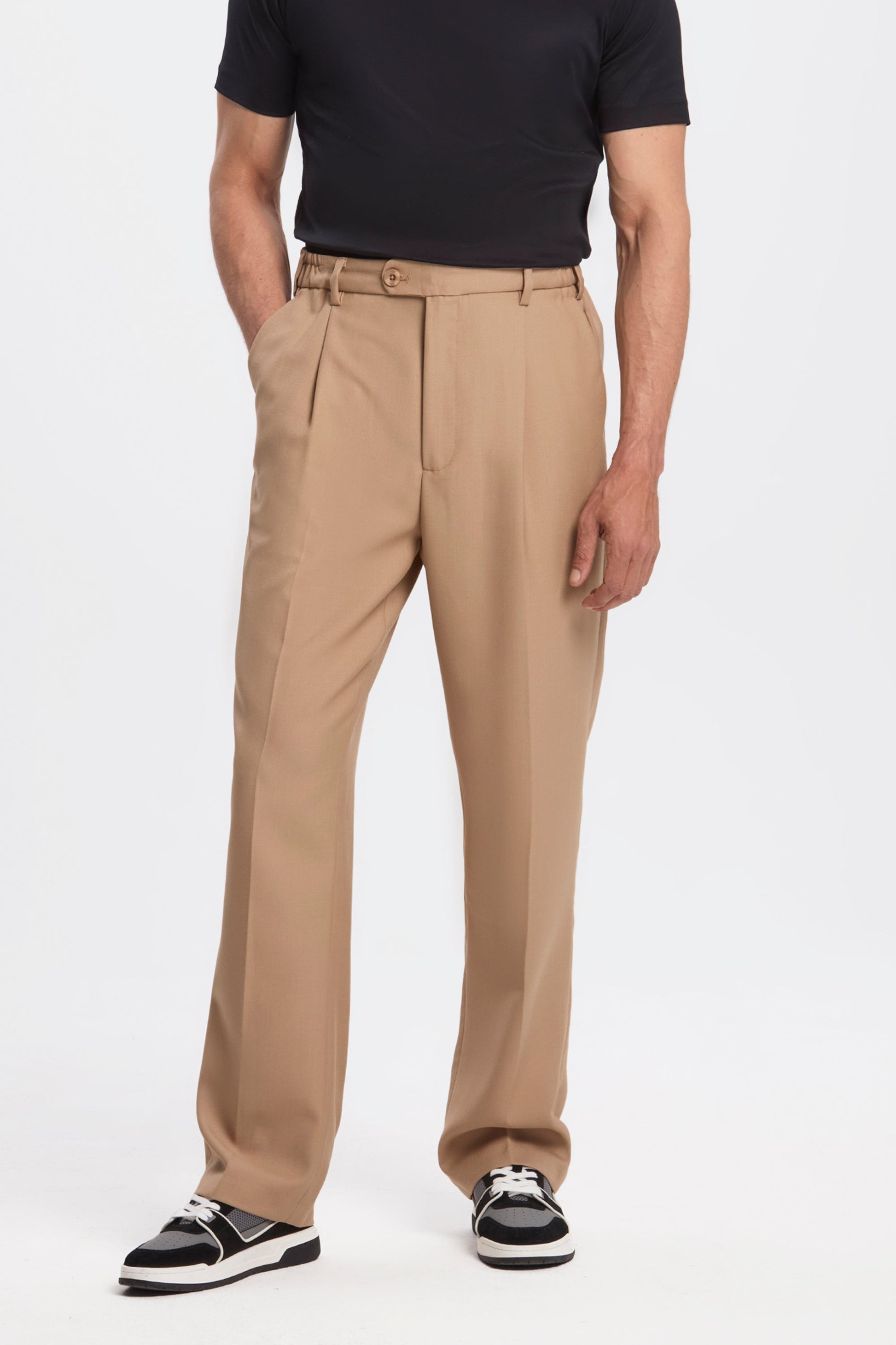 Hose mit weitem Bein aus einer hochwertigen 50/50-Wollmischung für Struktur und Fall. Entworfen mit einem verlängerten Bund vorne, Kunsthornknöpfen und Leistentaschen an der Seite und hinten. Gummizug an den Seiten für eine bequeme Passform.