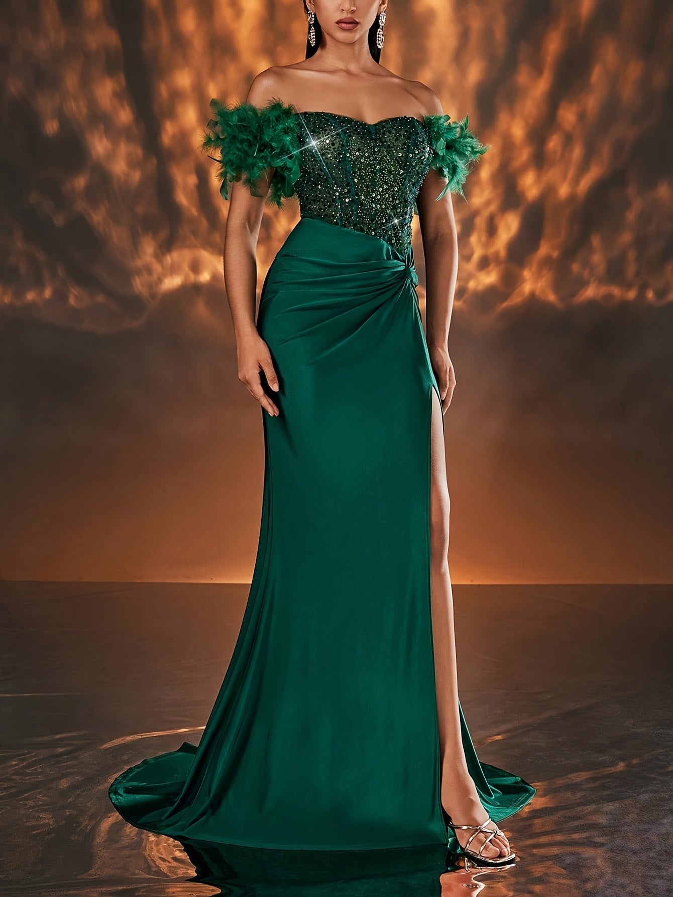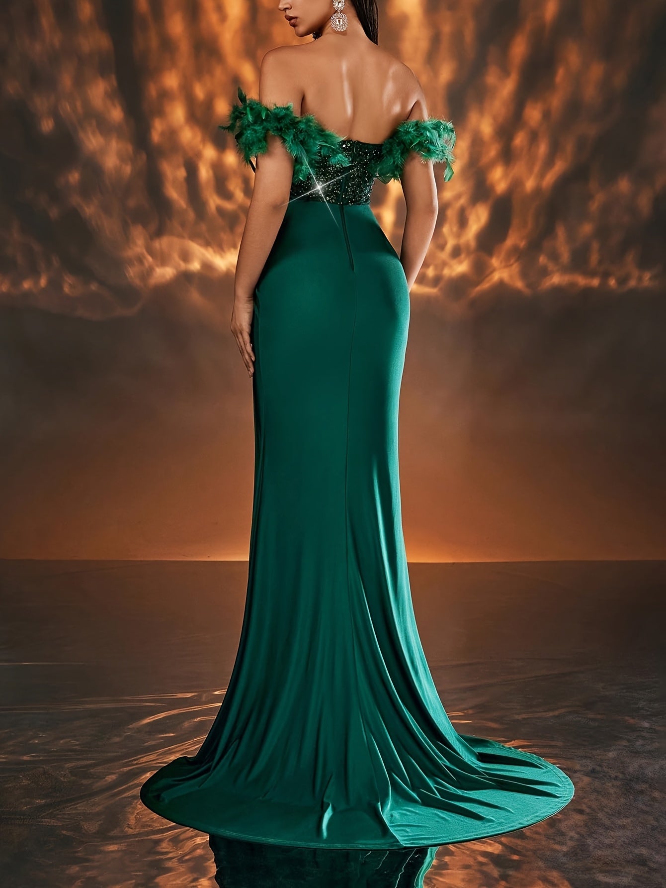 Deze adembenemende avondjurk combineert elegantie en verfijning met een verleidelijke pasvorm. De off-shoulder stijl met luxe pailletten en speelse veren zorgt voor een glamoureuze uitstraling. De hoge split en het nauwsluitende silhouet accentueren je figuur op een stijlvolle manier. Maak een grandioze indruk bij gala's, feesten en speciale gelegenheden met deze betoverende jurk van Mowa-Mode!