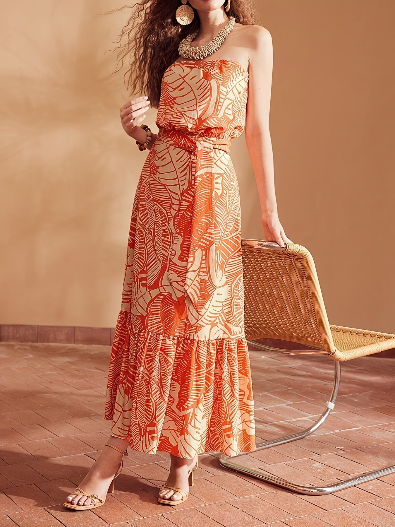 Deze elegante maxi-jurk met levendig bladmotief is jouw perfecte metgezel voor zonnige dagen, strandfeesten of tropische vakanties. De strapless halslijn en flatterende tailleceintuur zorgen voor een vrouwelijke en luchtige uitstraling. Creëer moeiteloos een stijlvolle look en bestel jouw favoriet vandaag nog bij Mowa-Mode!