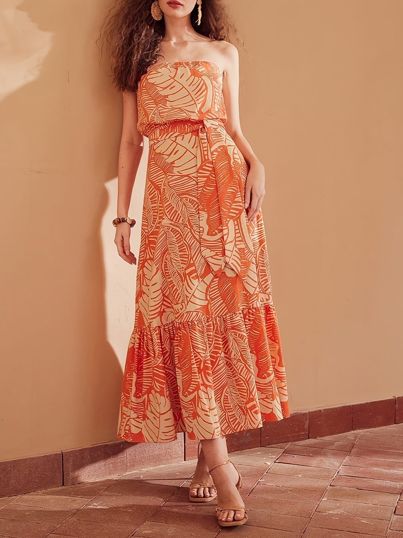Valerie | Strapless Maxi Jurk met Tropisch Bladmotief en Tailleceintuur voor Zomerse Elegantie