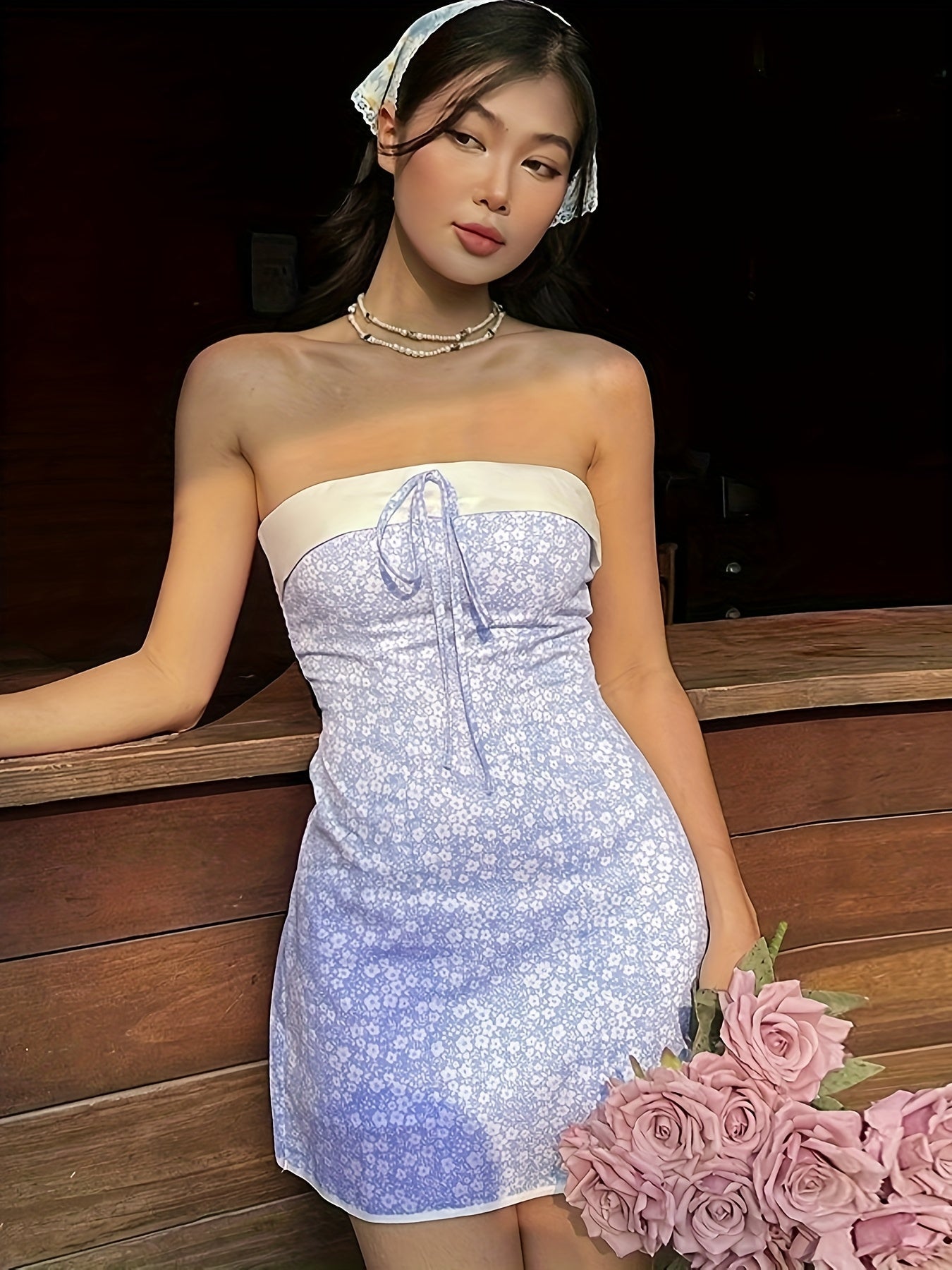 Vanessa | Bloemenjurk met Leren Bandjes en Zachte Blauw Tinten
