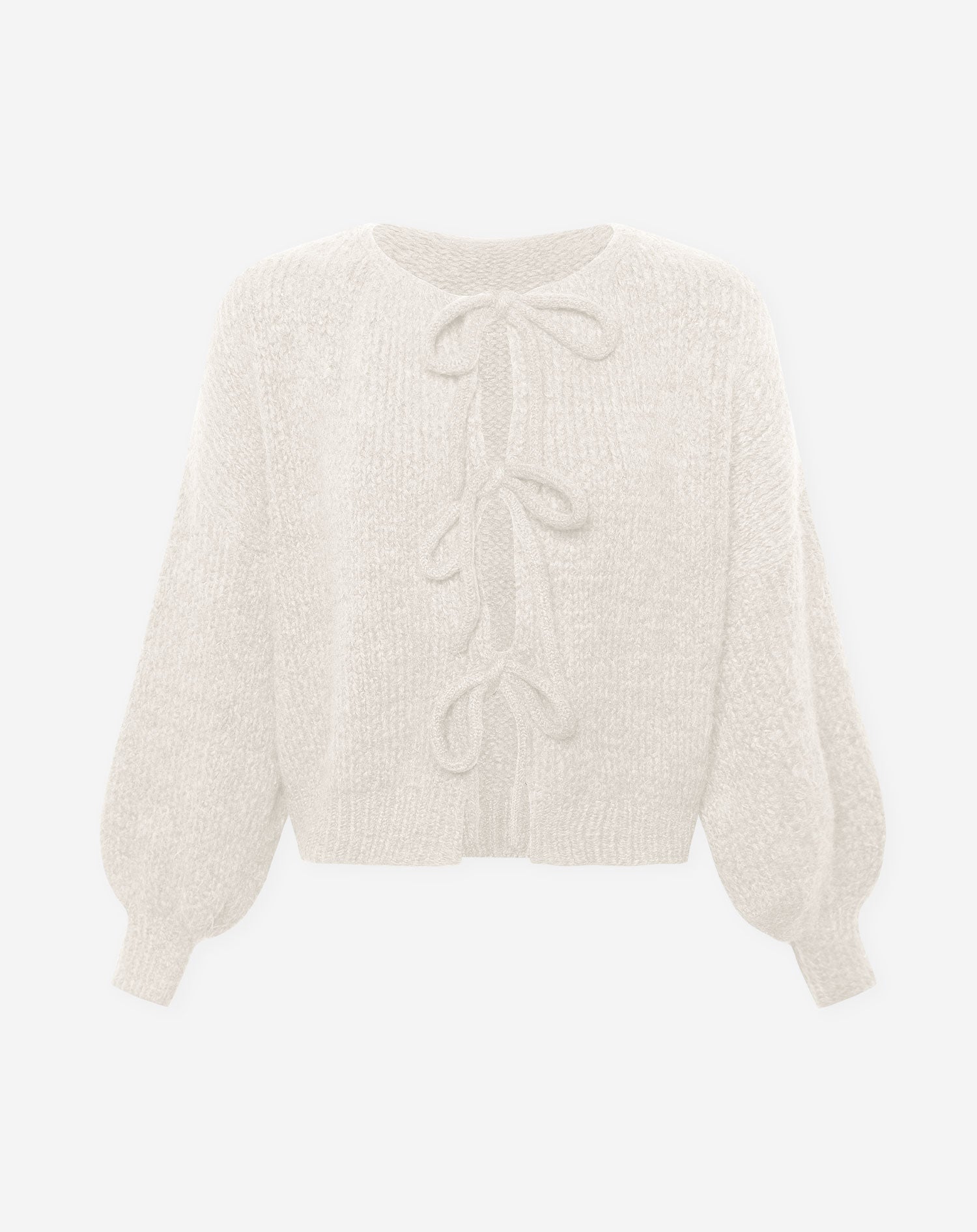 De cardigan is gemaakt van een zachte, comfortabele stof. De cardigan heeft pofmouwen en heeft strikjes aan de voorkant waardoor deze perfect bij de bows-trend van dit moment past.