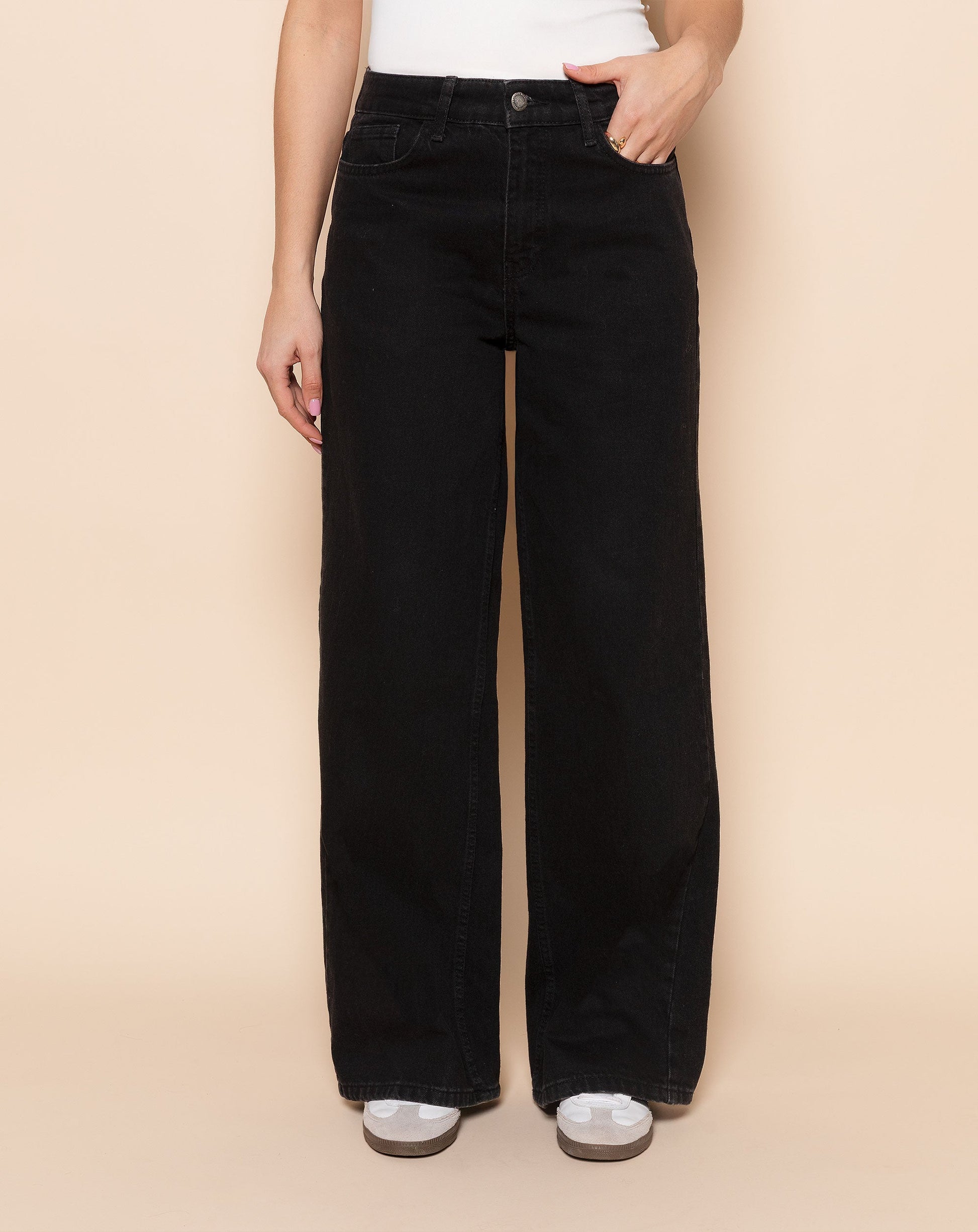 De broek is gemaakt van een zwarte denim stof. De broek heeft wijde pijpen en is mid-waisted. De broek heeft zakken aan de voor- en achterkant
