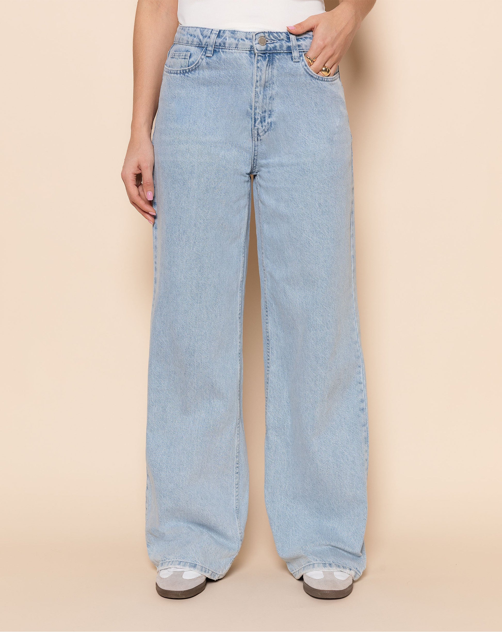De broek is gemaakt van een blauwe denim stof. De broek heeft wijde pijpen en is mid-waisted. De broek heeft zakken aan de voor- en achterkant