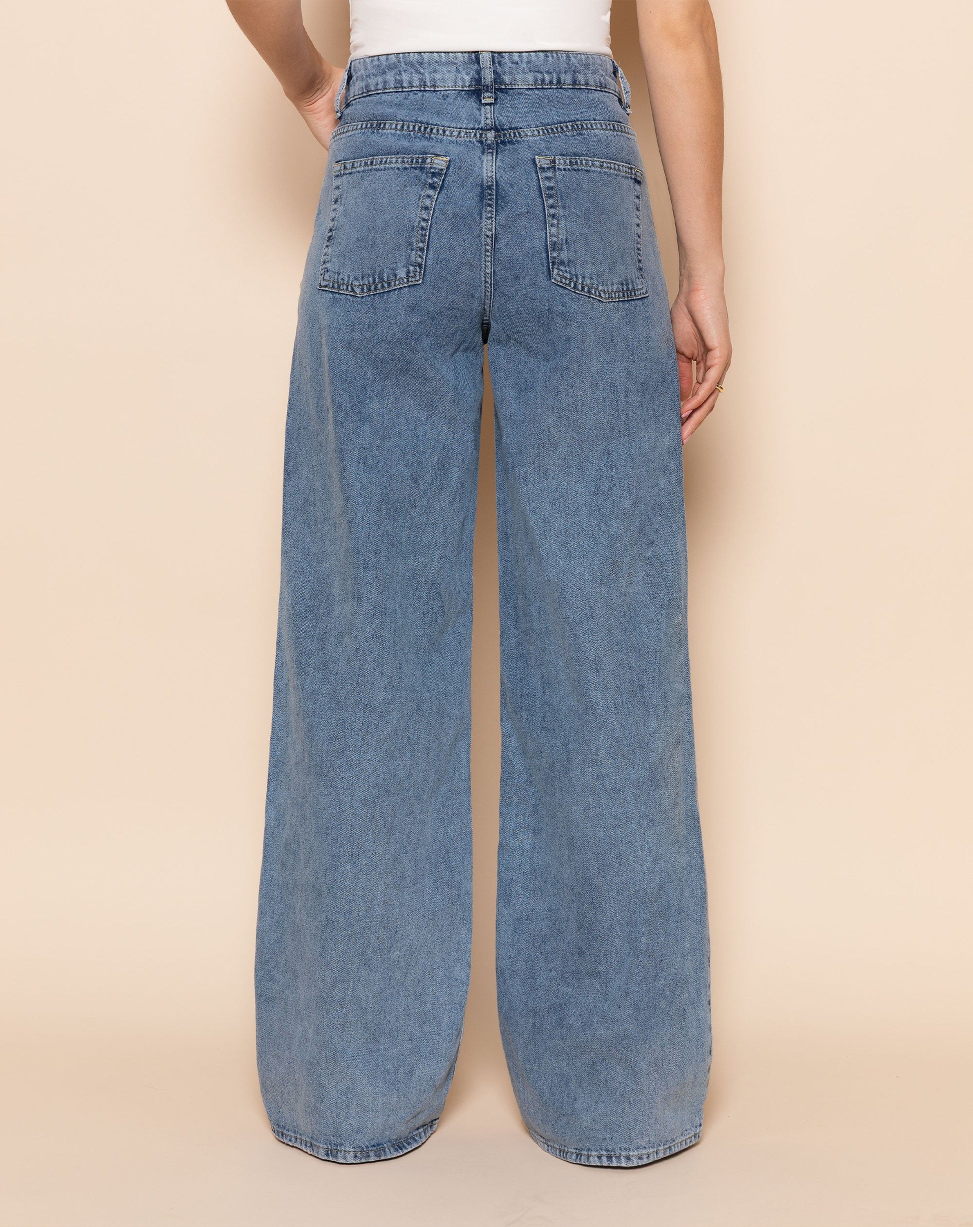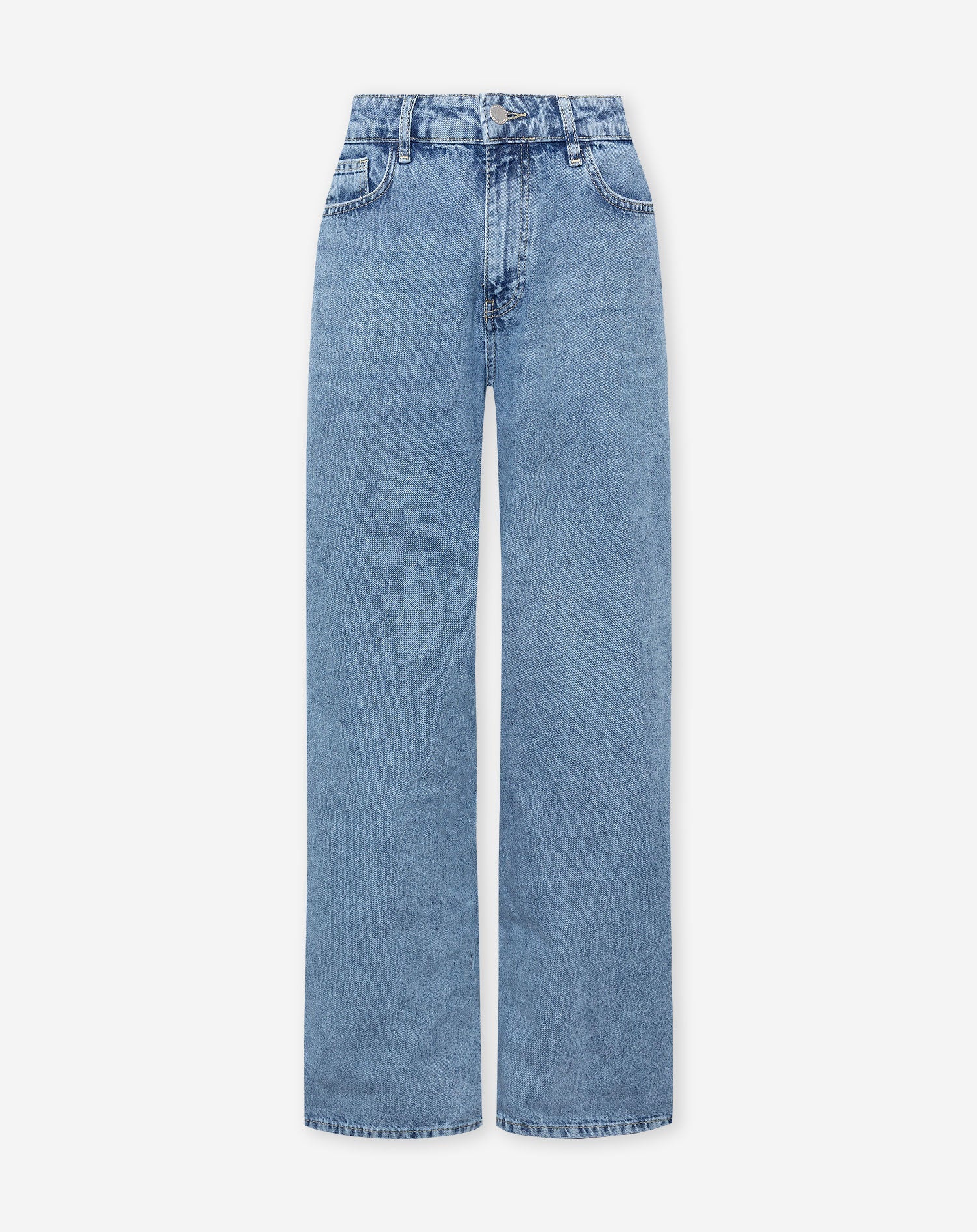 De broek is gemaakt van een blauwe denim stof. De broek heeft wijde pijpen en is mid-waisted. De broek heeft zakken aan de voor- en achterkant
