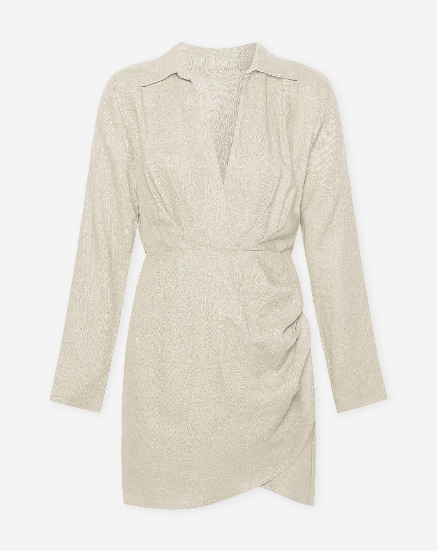 De jurk is gemaakt van een beige, linen stof. De jurk heeft een v-hals, heeft elastiek rond het middel en is geruched rond het middel.