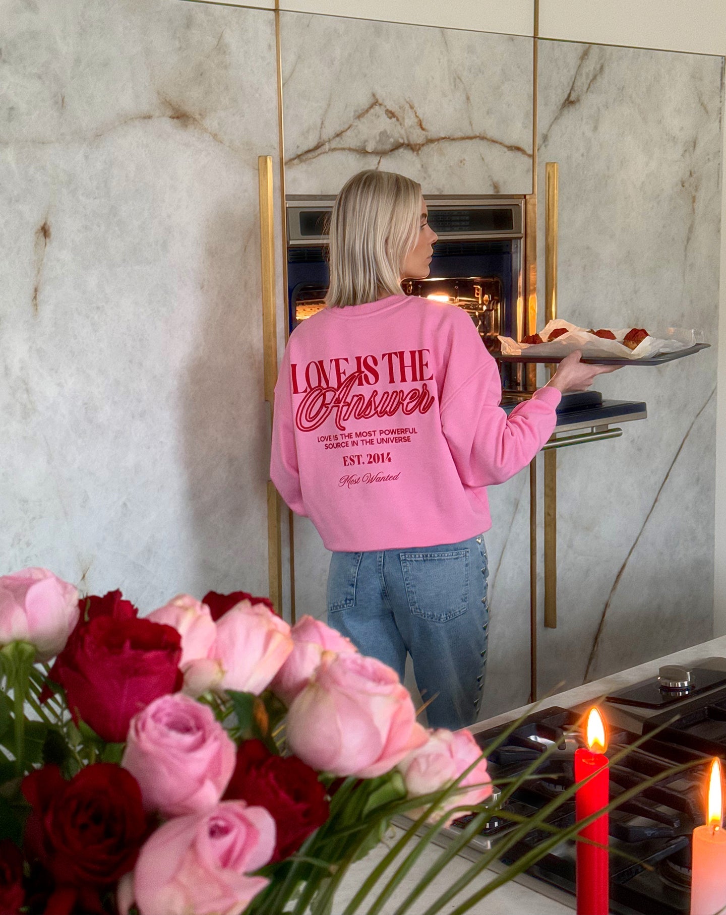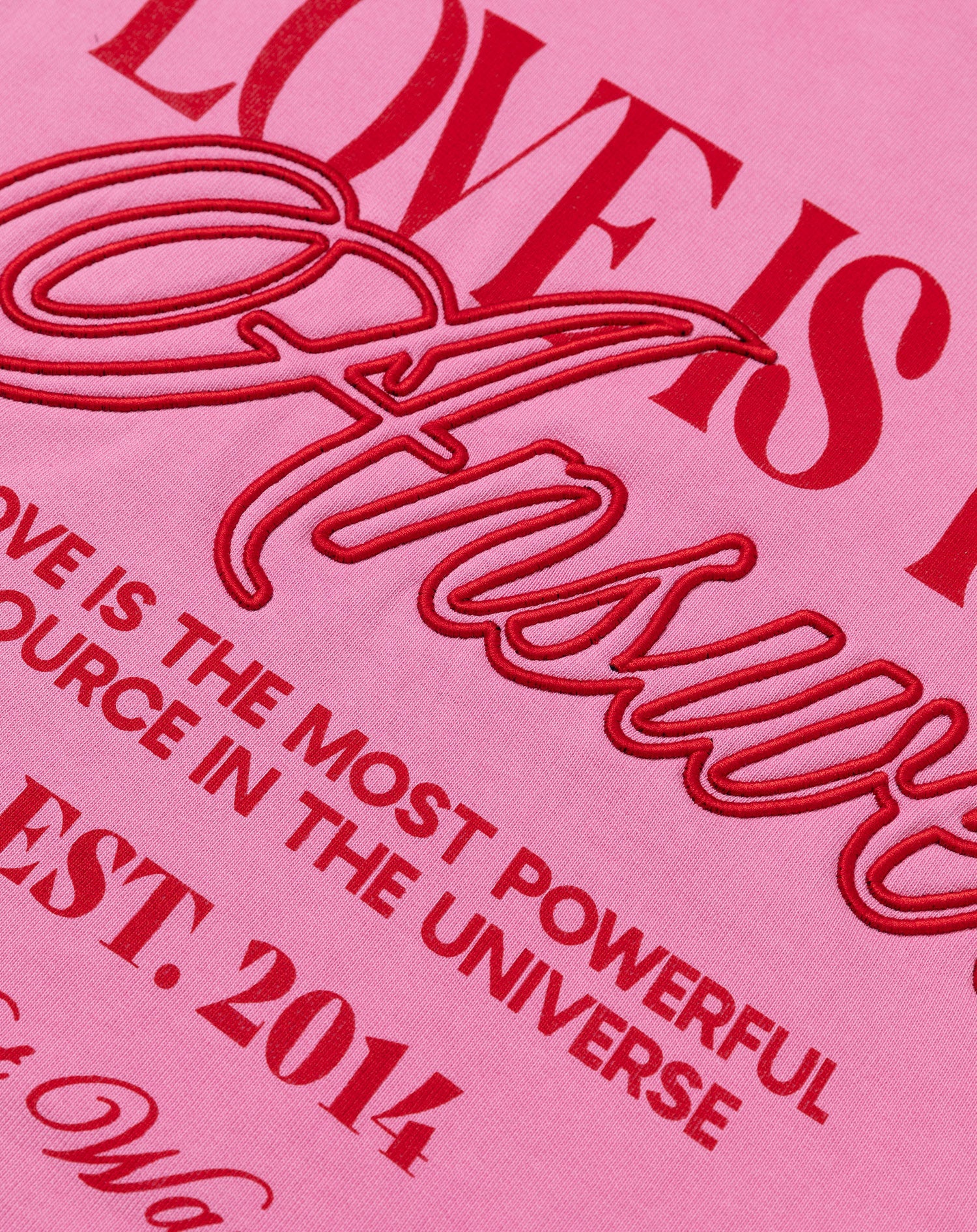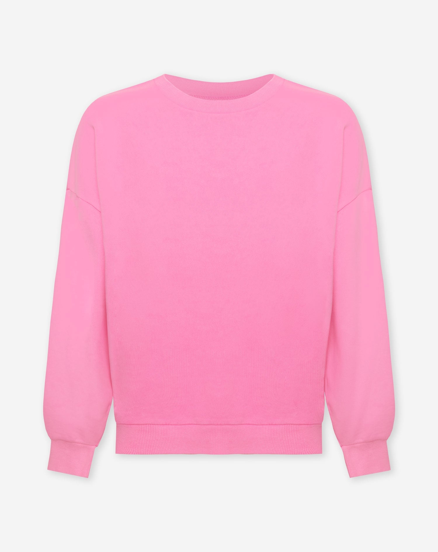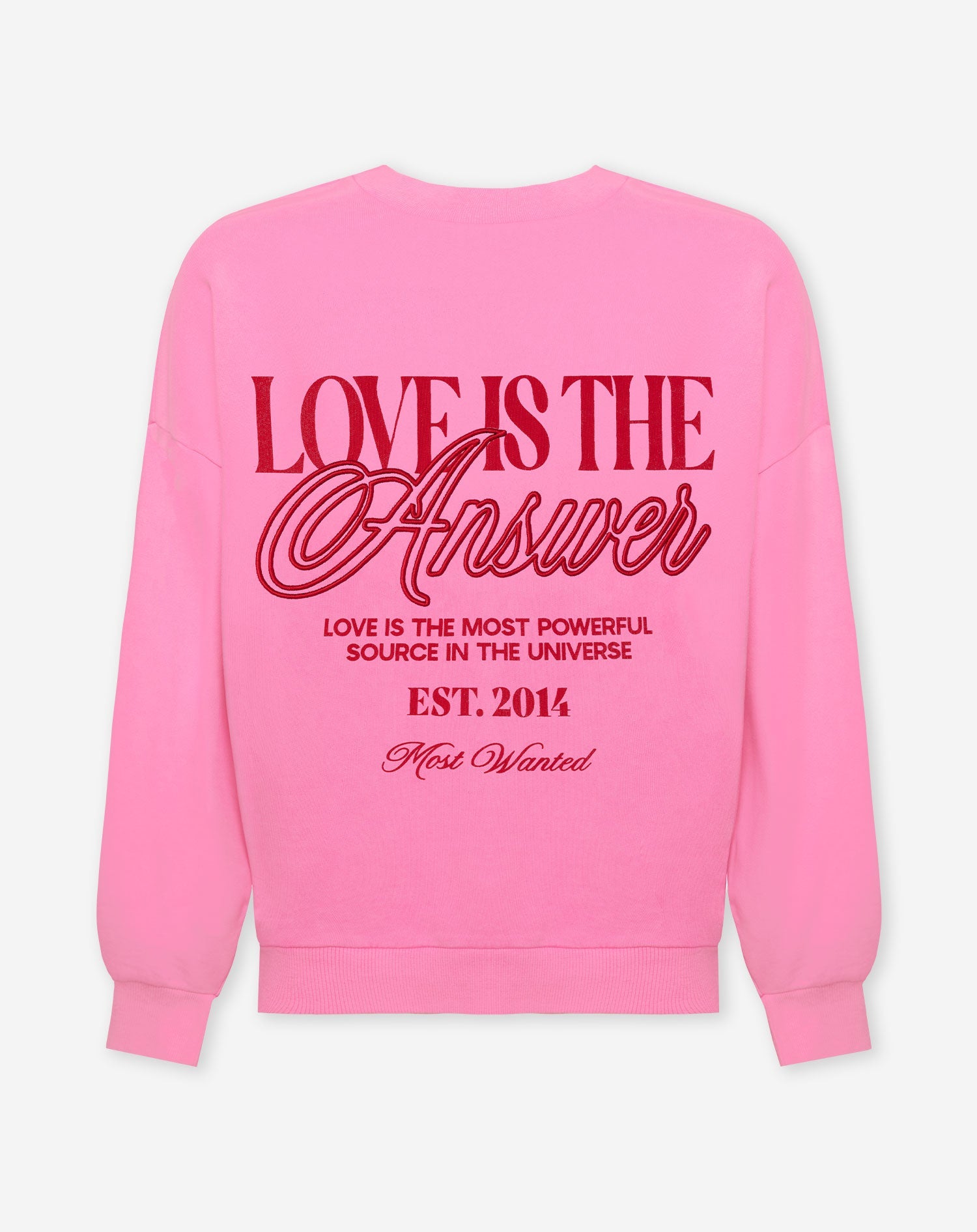 De sweater is gemaakt van een lichtroze, katoenen stof. De sweater heeft een oversized fit en heeft een ronde hals. De sweater heeft een rode opdruk aan de voorkant.