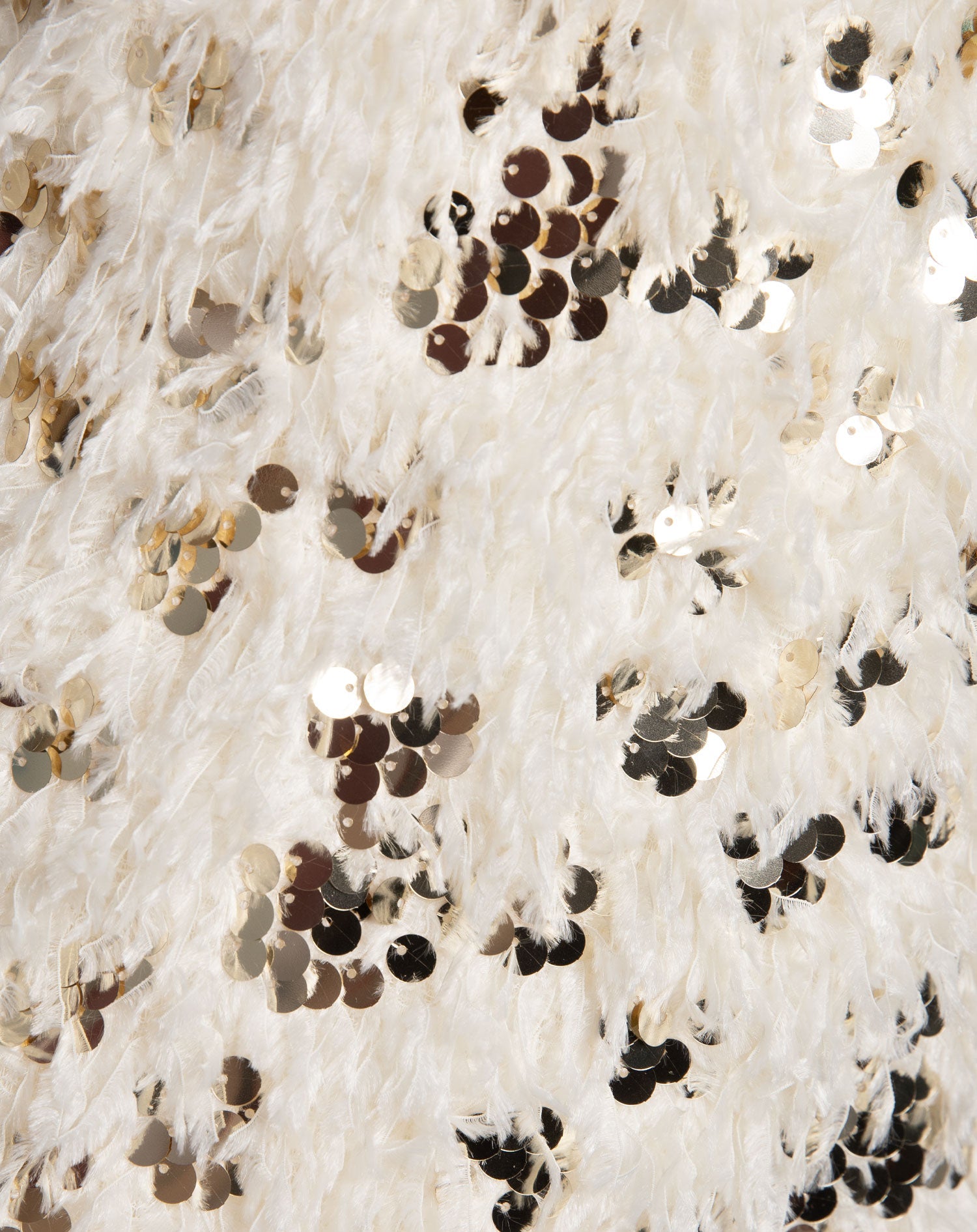 Stop looking babe, you have found the perfect party dress! De jurk is gemaakt van een beige feather stof en heeft sequins allover aan de voor- en achterkant. Het jurkje heeft verstelbare bandjes.