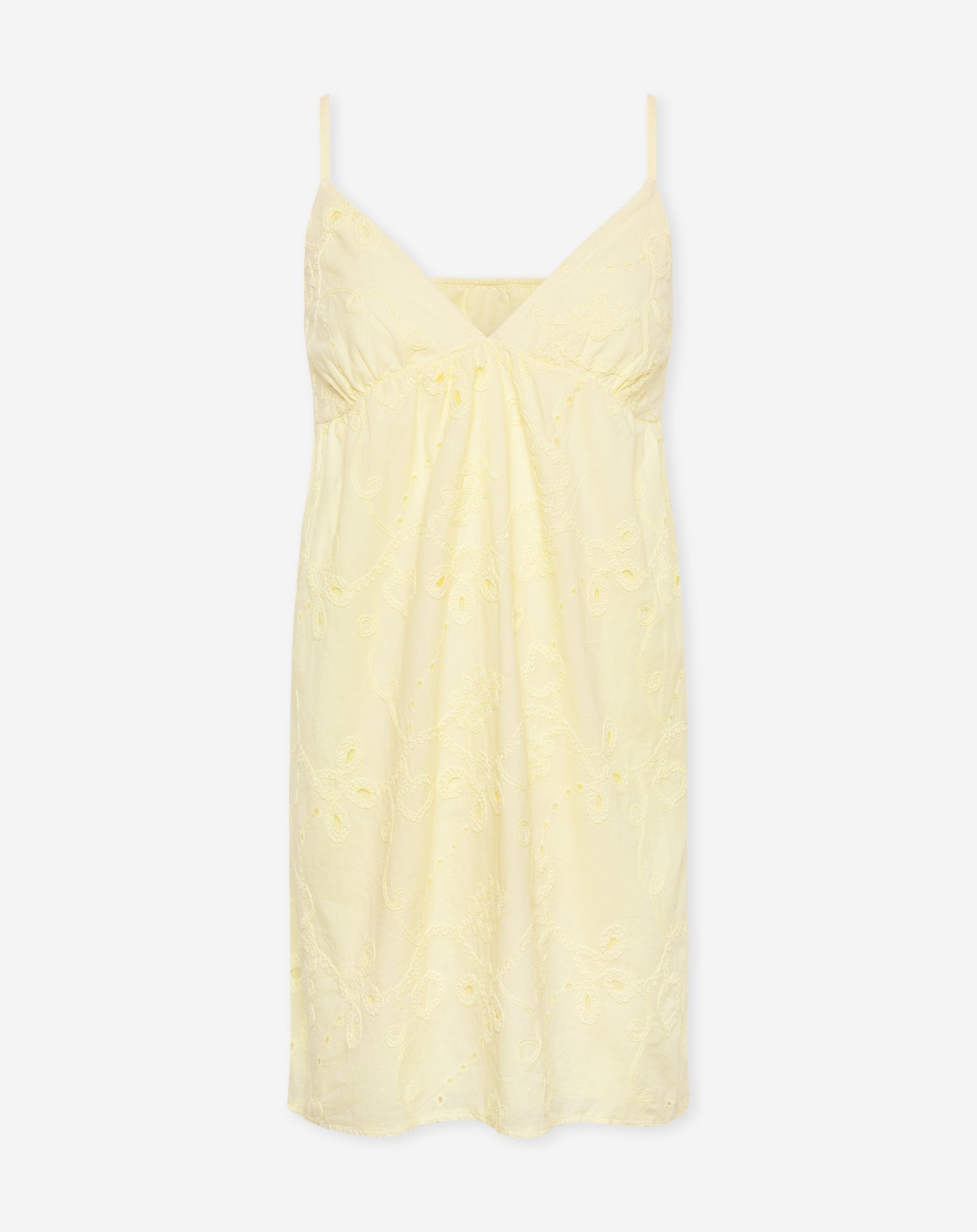 De jurk is gemaakt van een luchtige, katoenen stof. De jurk heeft een geborduurde bloemenpatroon en door de botergele kleur, past het perfect in de butteryellow trend van dit moment!