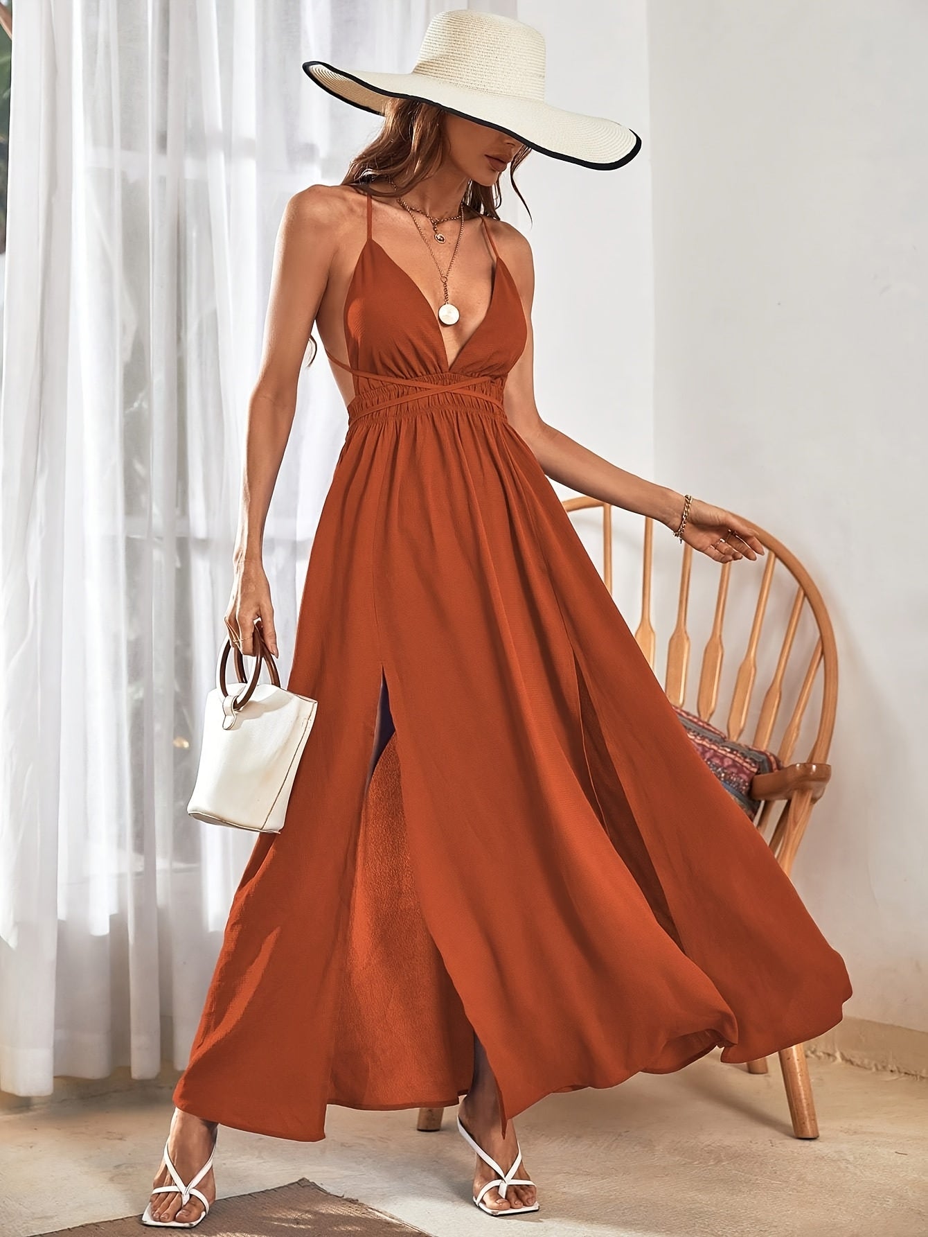 Deze ademende maxi-jurk met een diepe V-hals en een speelse open rug is de perfecte keuze voor een stijlvolle en verfijnde look. De elastische taille en de subtiele split maken deze jurk ideaal voor zowel een strandwandeling als een chic diner. Bestel deze must-have jurk vandaag nog bij Mowa-Mode en laat jezelf stralen!
