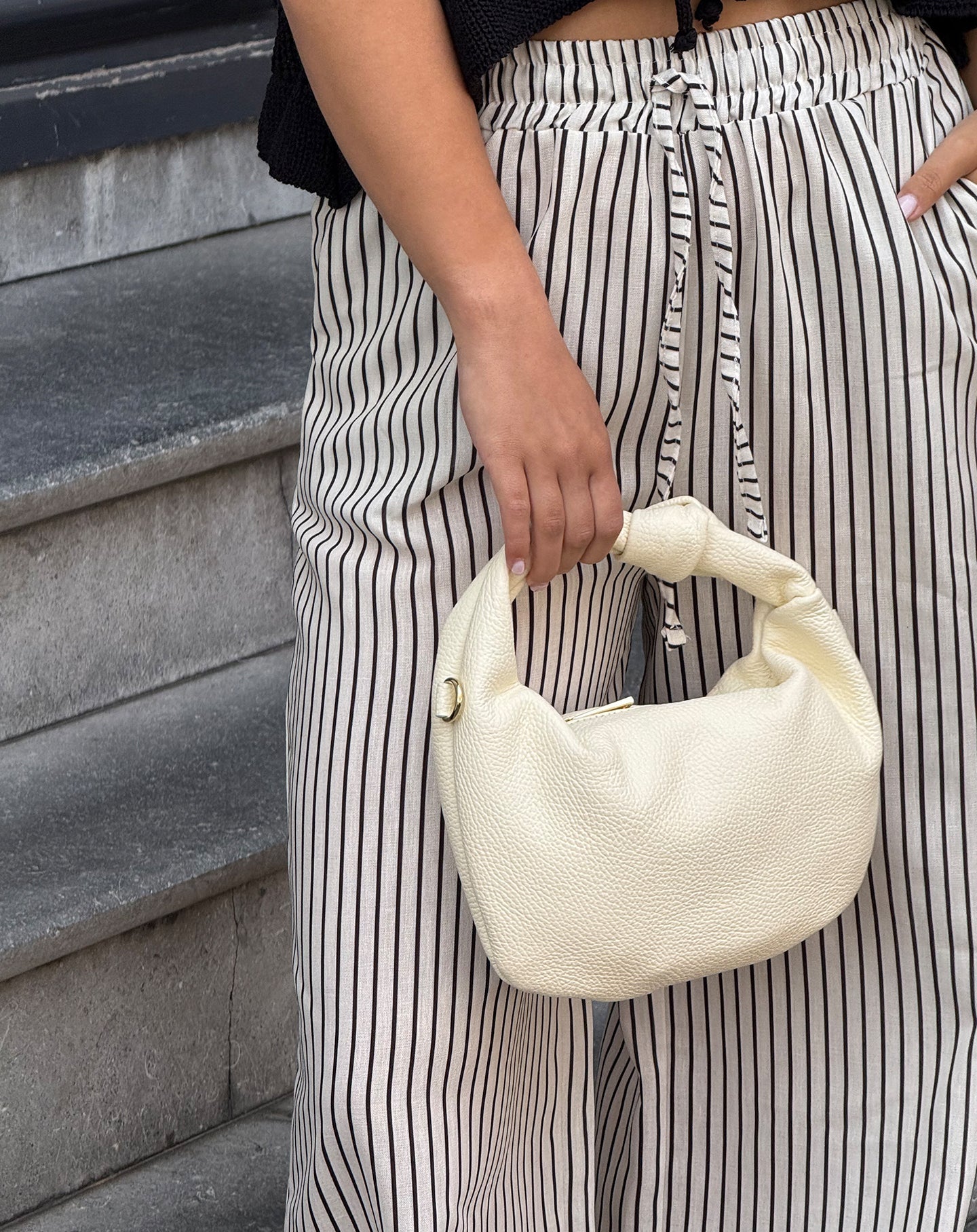 De tas is gemaakt van echt leer. De tas heeft een knot aan de bovenkant en heeft gouden details. De tas heeft een ritssluiting en heeft een zijvakje. De tas komt met een extra, verstelbaar hengsel.