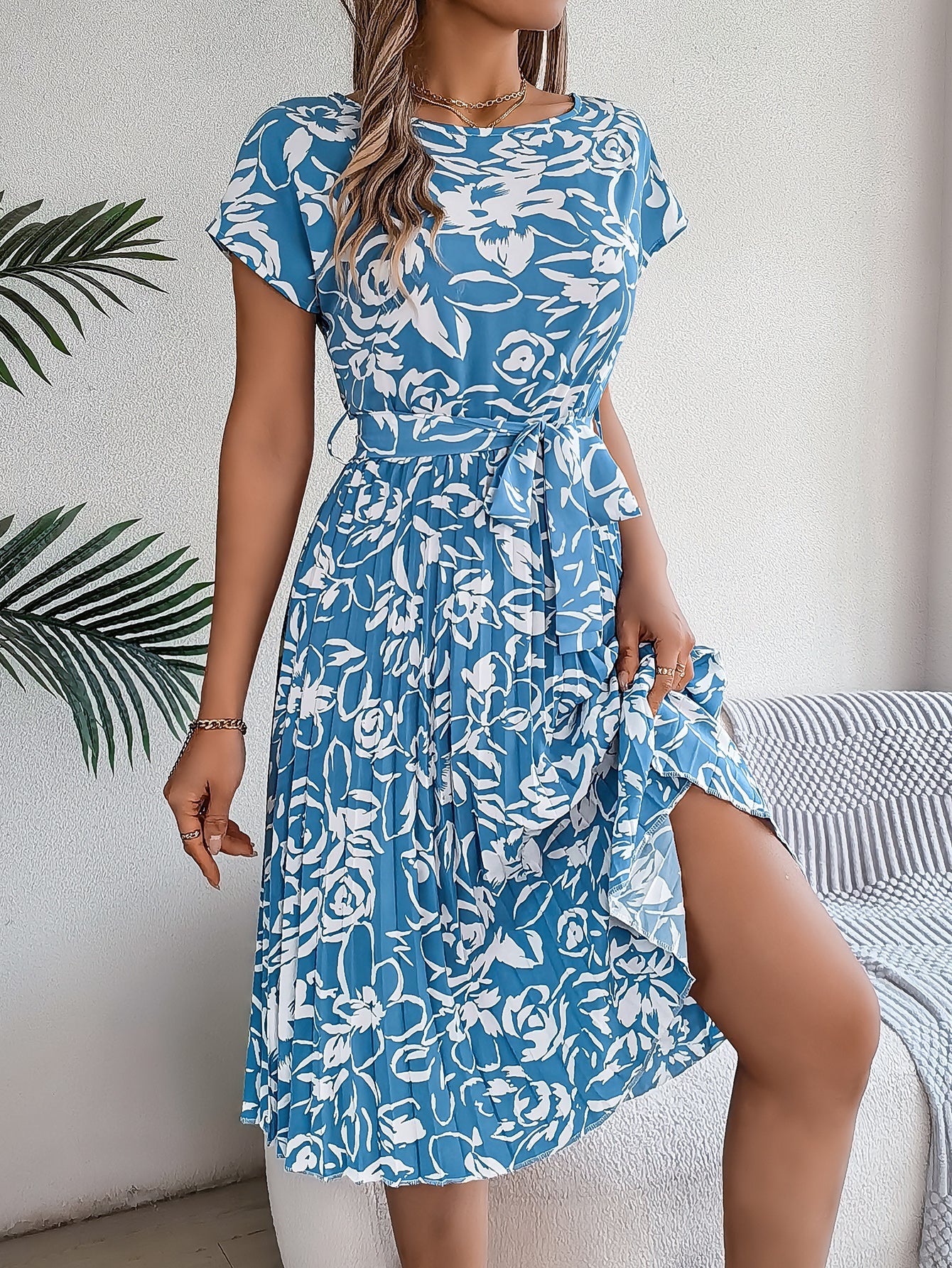 Deze bloemenjurk combineert een tijdloos ontwerp met een comfortabele pasvorm, perfect voor elke gelegenheid. De vloeiende plissérok en de bijpassende ceintuur accentueren je taille en geven een vrouwelijke uitstraling. Met korte mouwen en een ronde hals biedt deze jurk een moeiteloze elegantie die je garderobe compleet maakt.