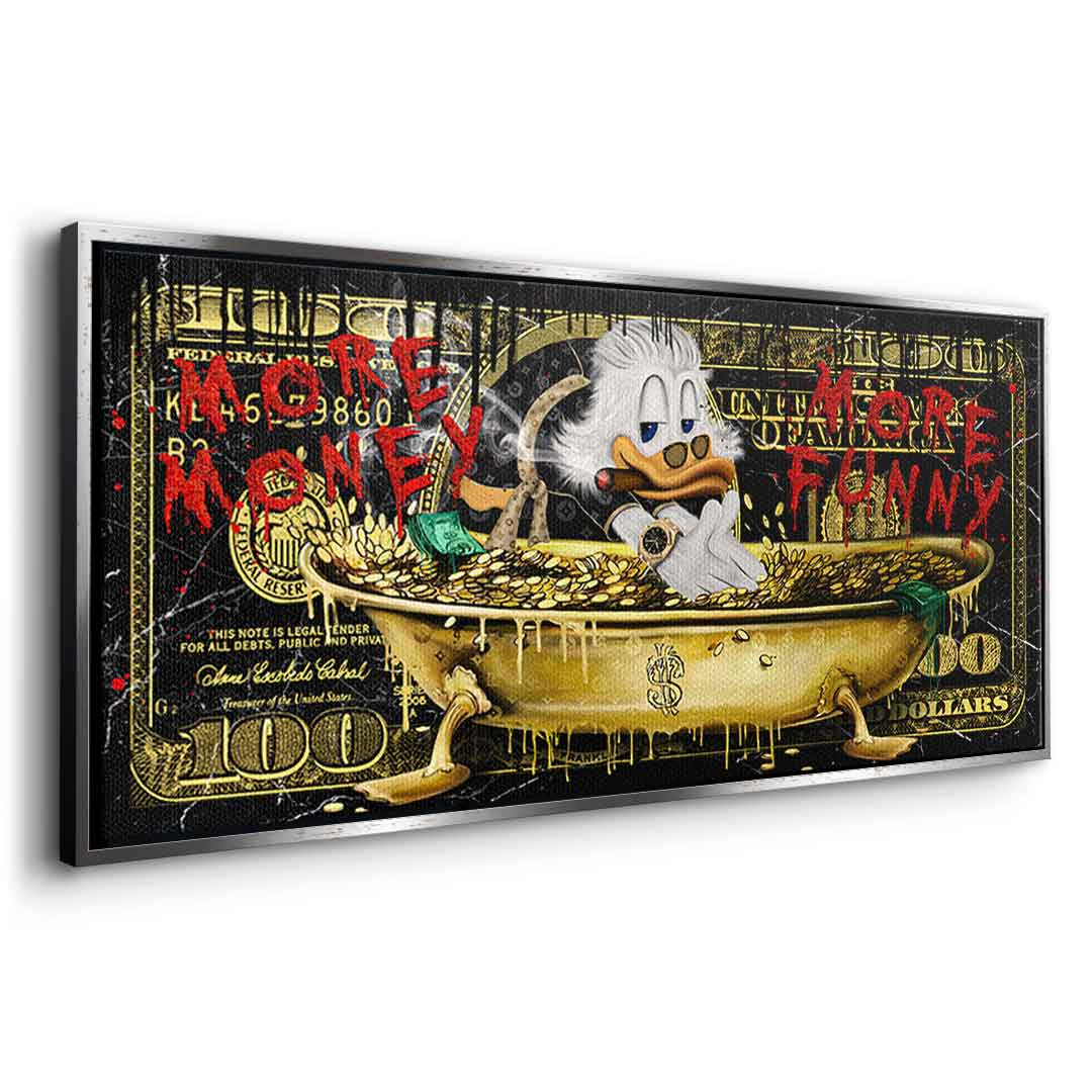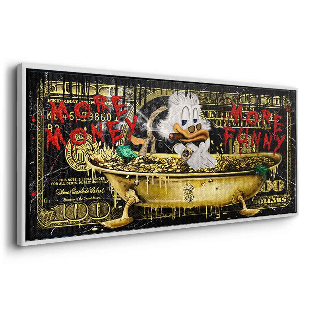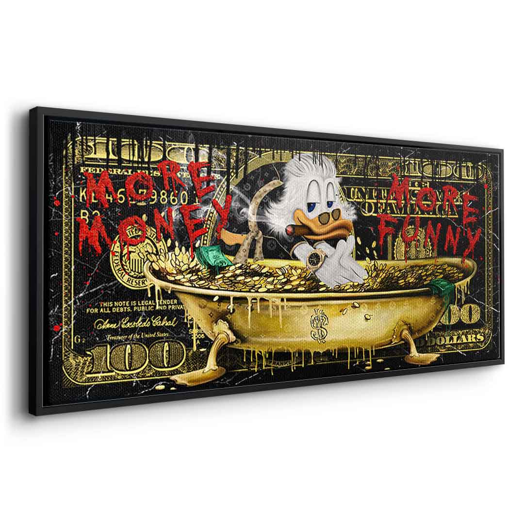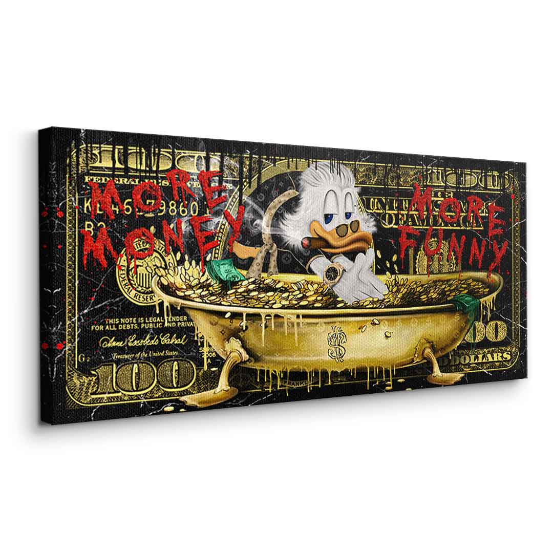 The sequel to "NO MONEY DUCK" in Pop Art style. Here, wearing a luxurious bathrobe, you jump into a bathtub filled with gold coins and enjoy life. The picture is primarily impressive due to the combination of gold and black with red accents. The saying "More Money More Funny" reflects the joy of life and life goals. The premium canvas is stretched on a high-quality solid stretcher frame - ready to hang.