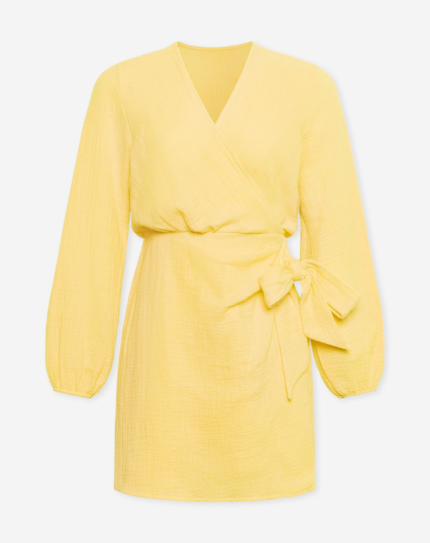 De jurk is gemaakt van een luchtige, botergele stof. De jurk heeft een strik bij de middel, waardoor het lijkt alsof het een wrap dress is.
