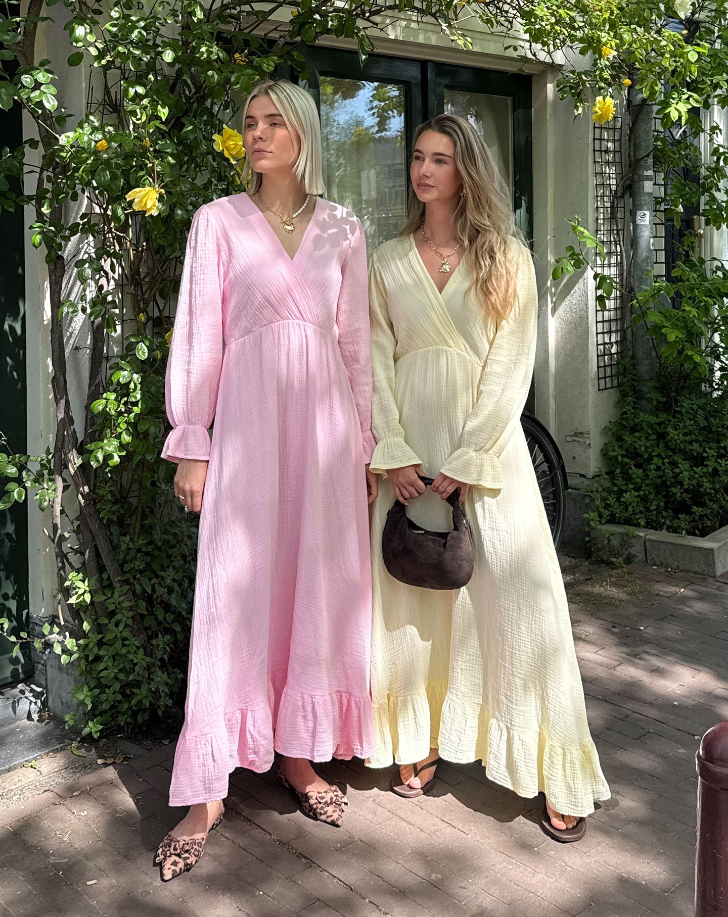 De jurk is gemaakt van een luchtige, katoenen mousseline stof. De jurk heeft een maxi model, heeft een elastieken band rond het middel en heeft een v-hals.