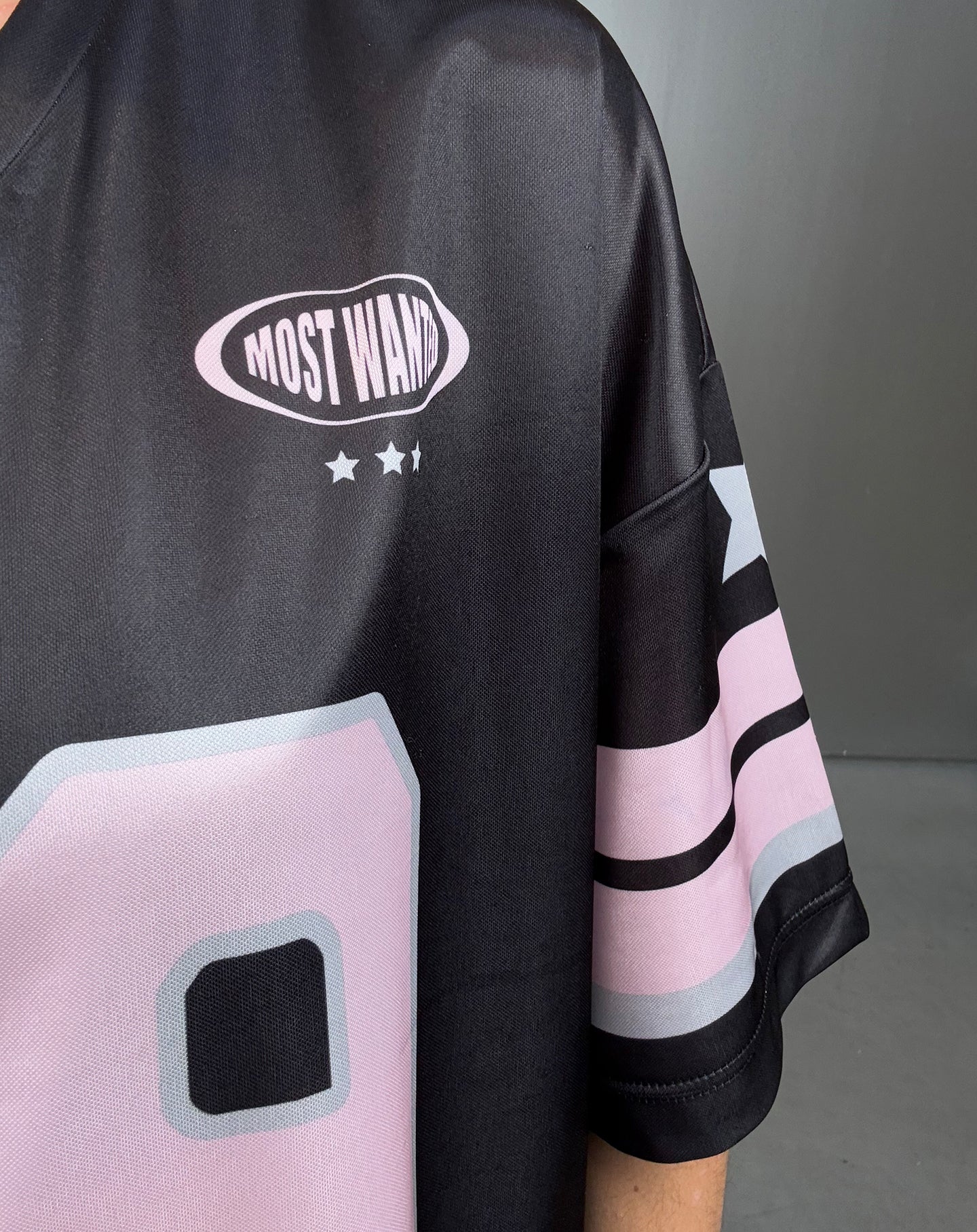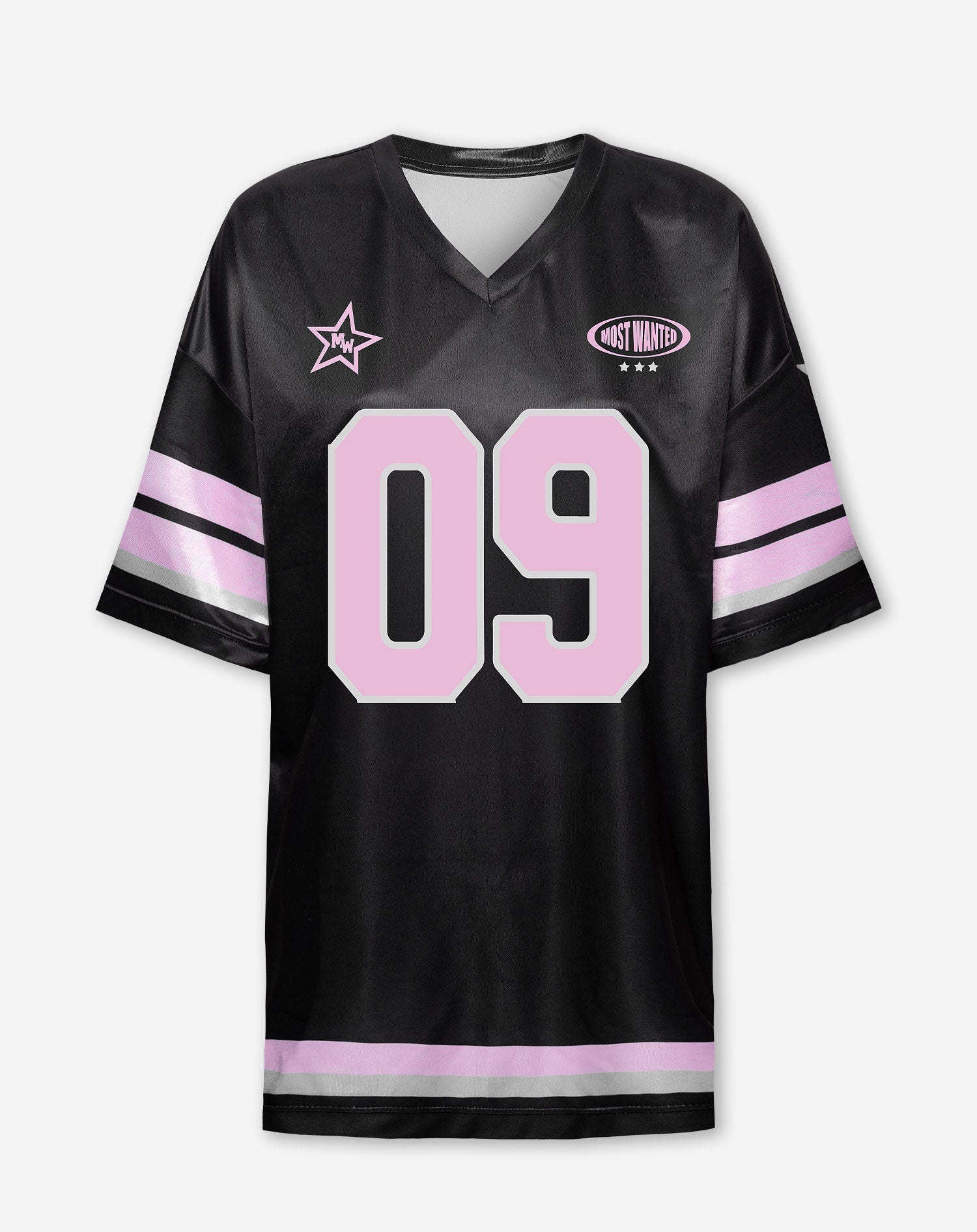 De jurk is gemaakt van een zwarte, glimmende stof en heeft lichtroze en zilveren details. De jurk heeft een v-hals en een oversized fit en is een echte eye catcher.