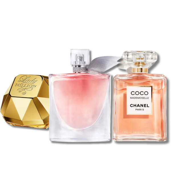 This perfume combo is the perfect choice for the woman who appreciates the quality and uniqueness of iconic fragrances. Place your order now and take with you the provocation of CHANEL COCO MADEMOISELLE, the elegance of Lady Million, and the sweetness of LA VIE EST BELLE!