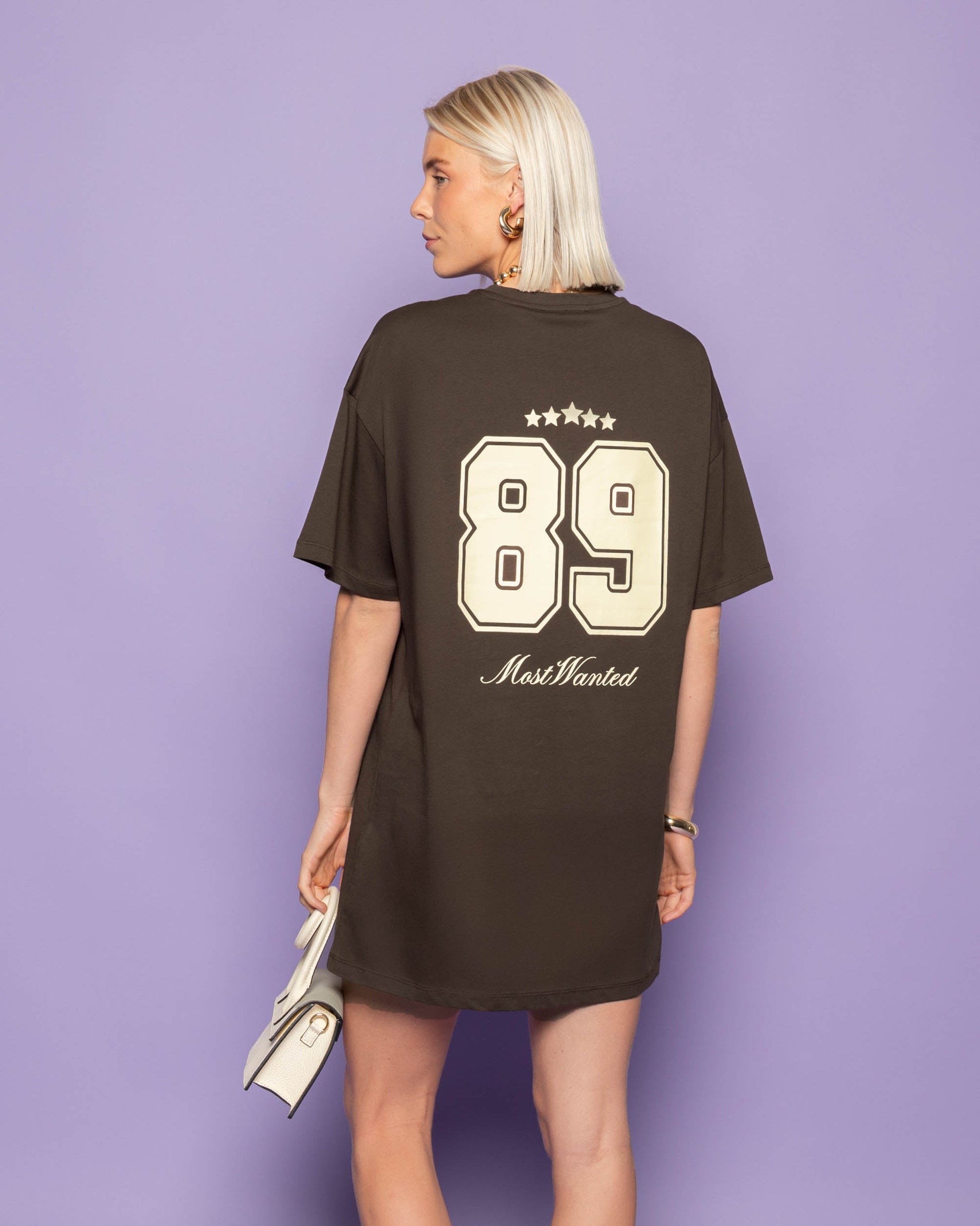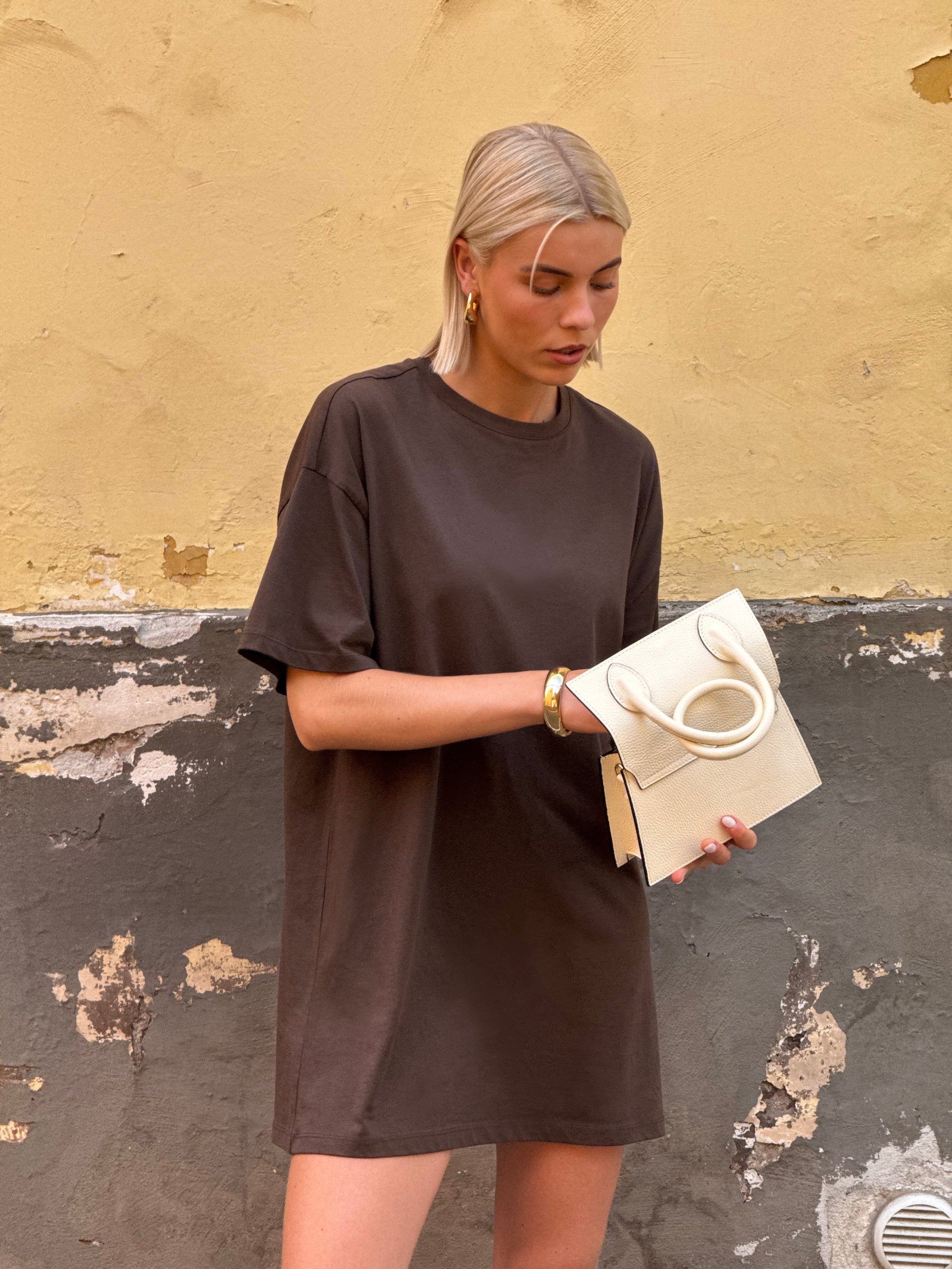 De jurk is gemaakt van een bruine, katoenen stof. De jurk heeft een opdruk aan de achterkant en heeft een oversized fit.