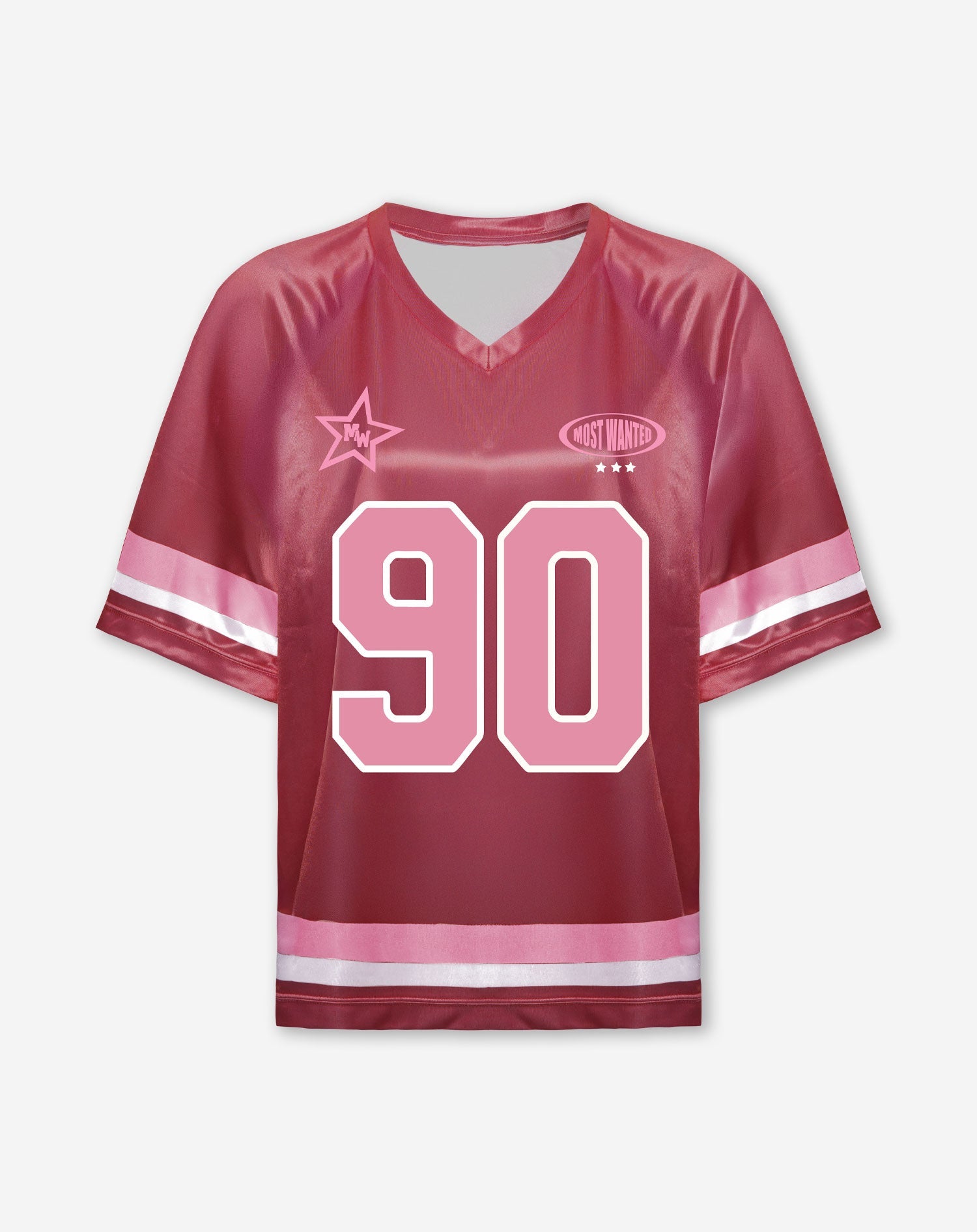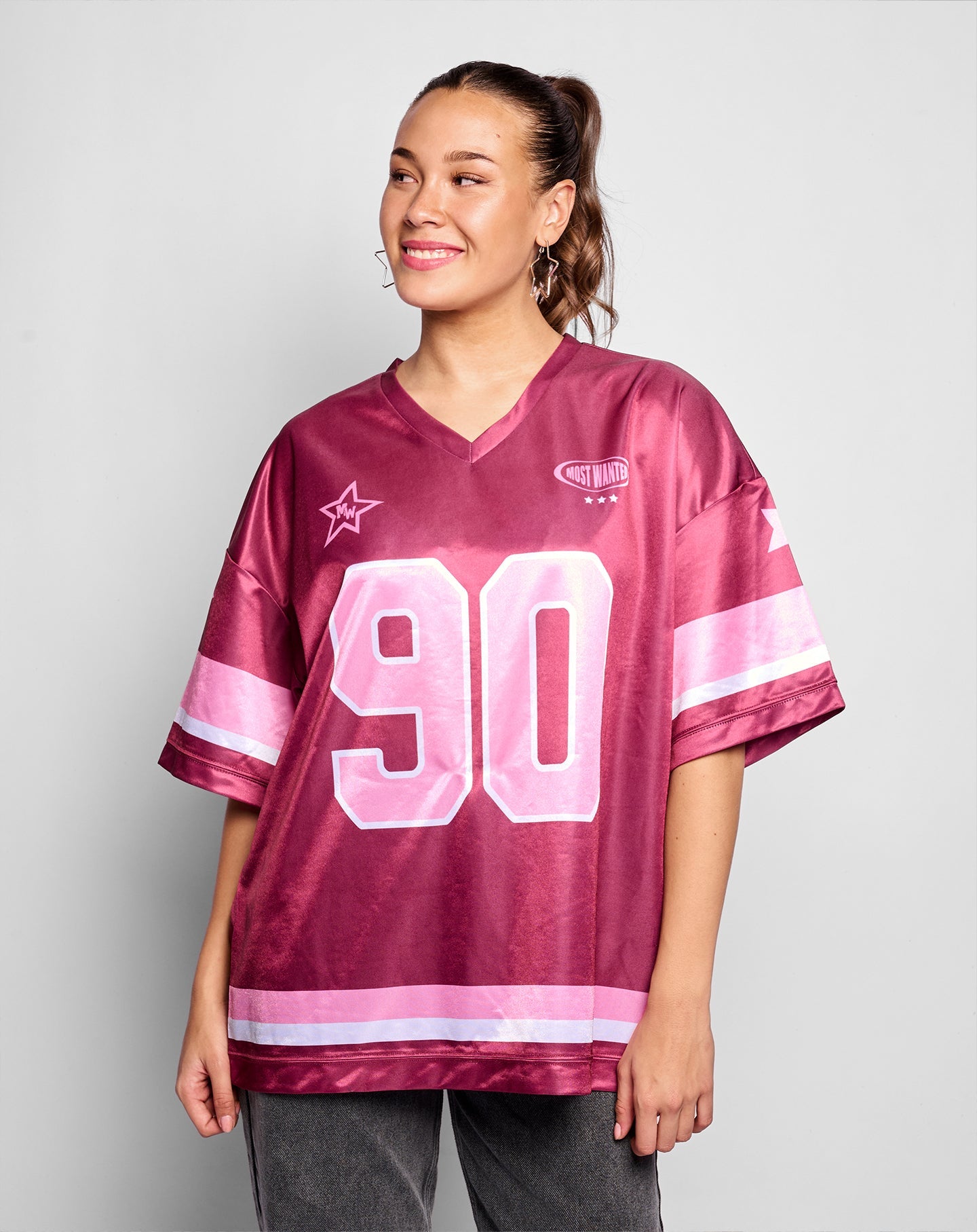 De tee is gemaakt van een bordeaux-rode, glimmende stof en heeft lichtroze details. De tee heeft een v-hals en een oversized fit en is een echte eye catcher.